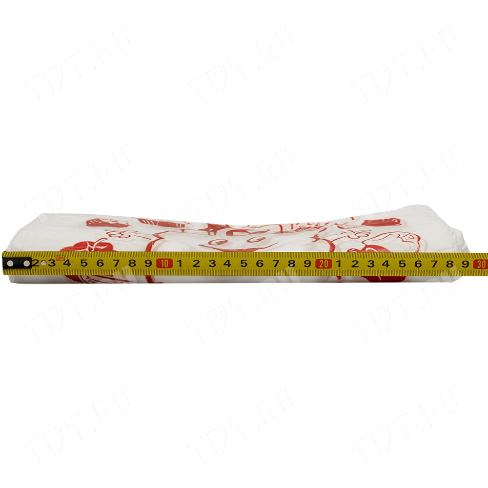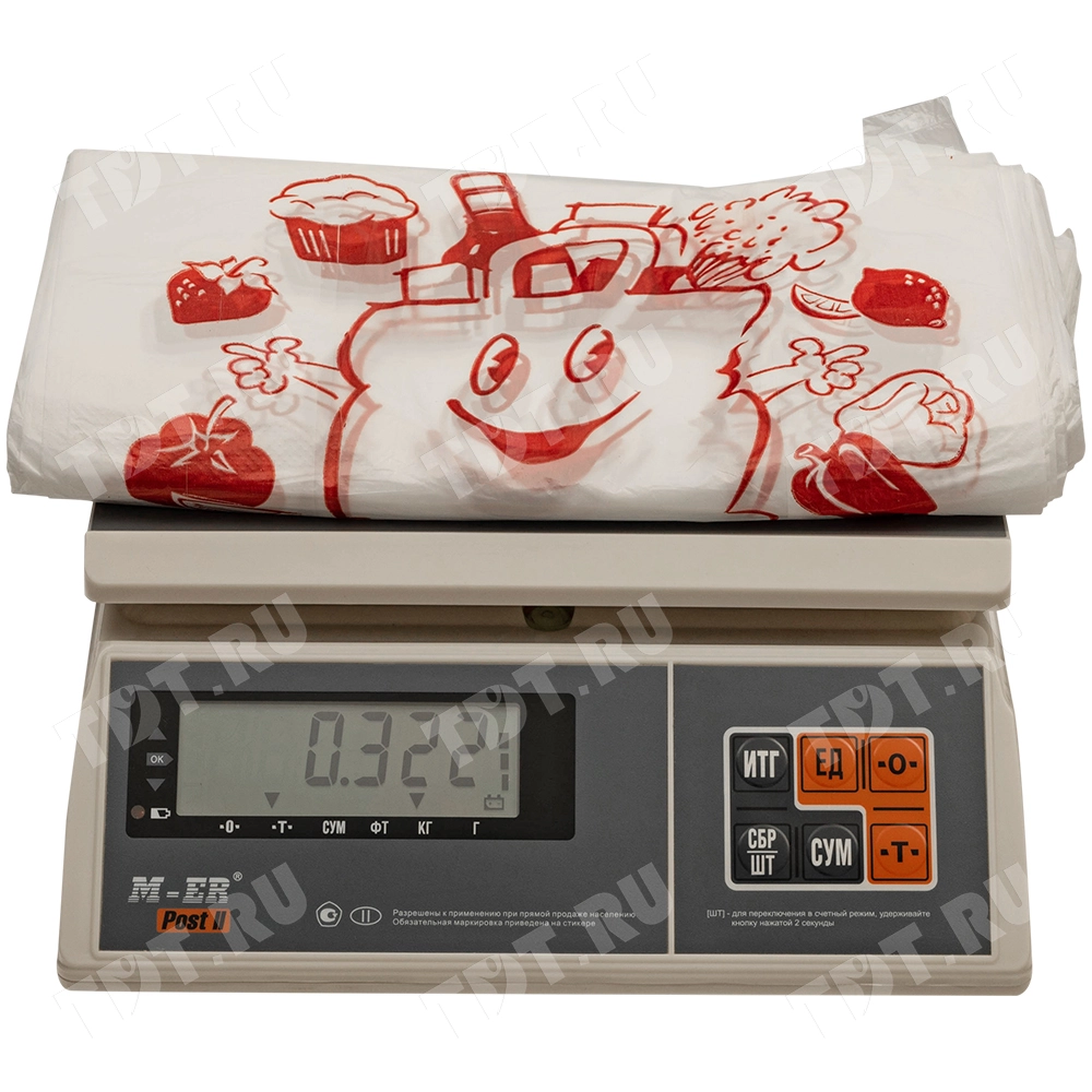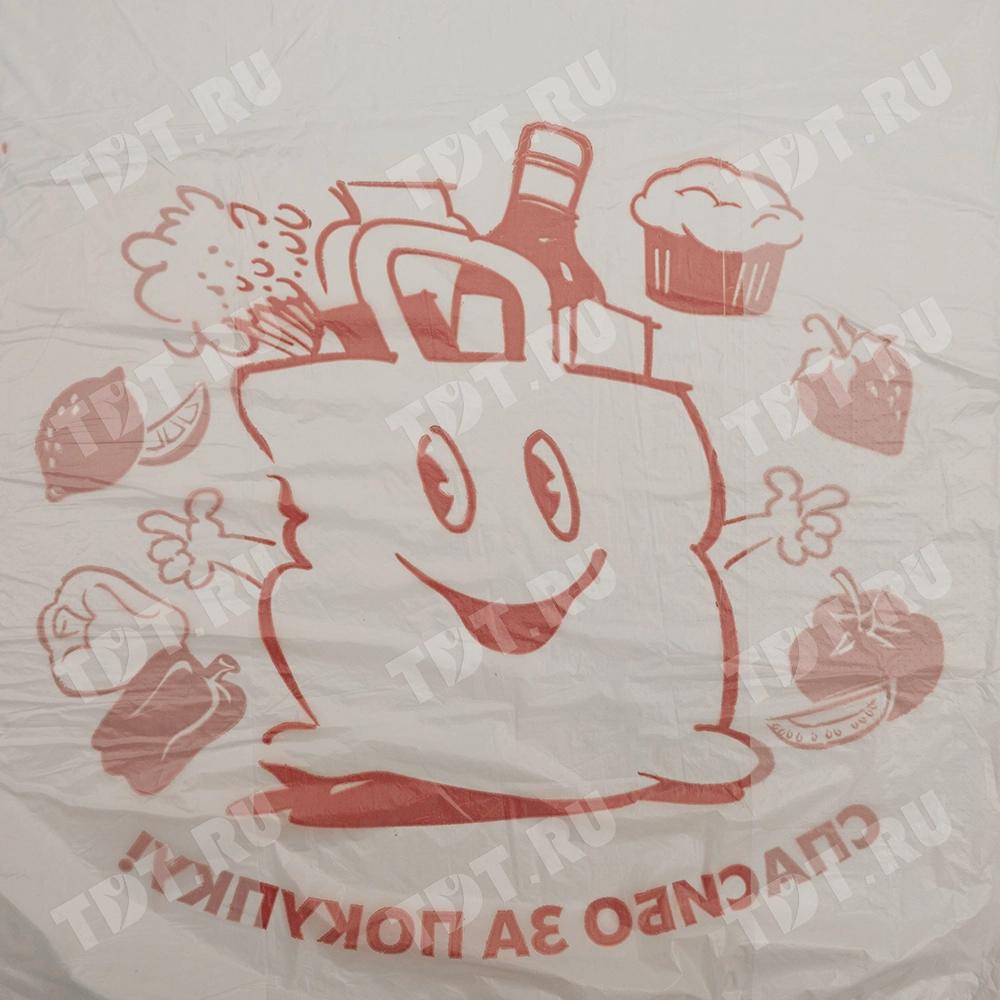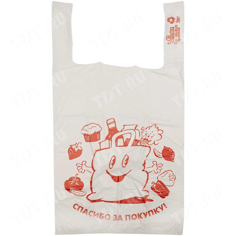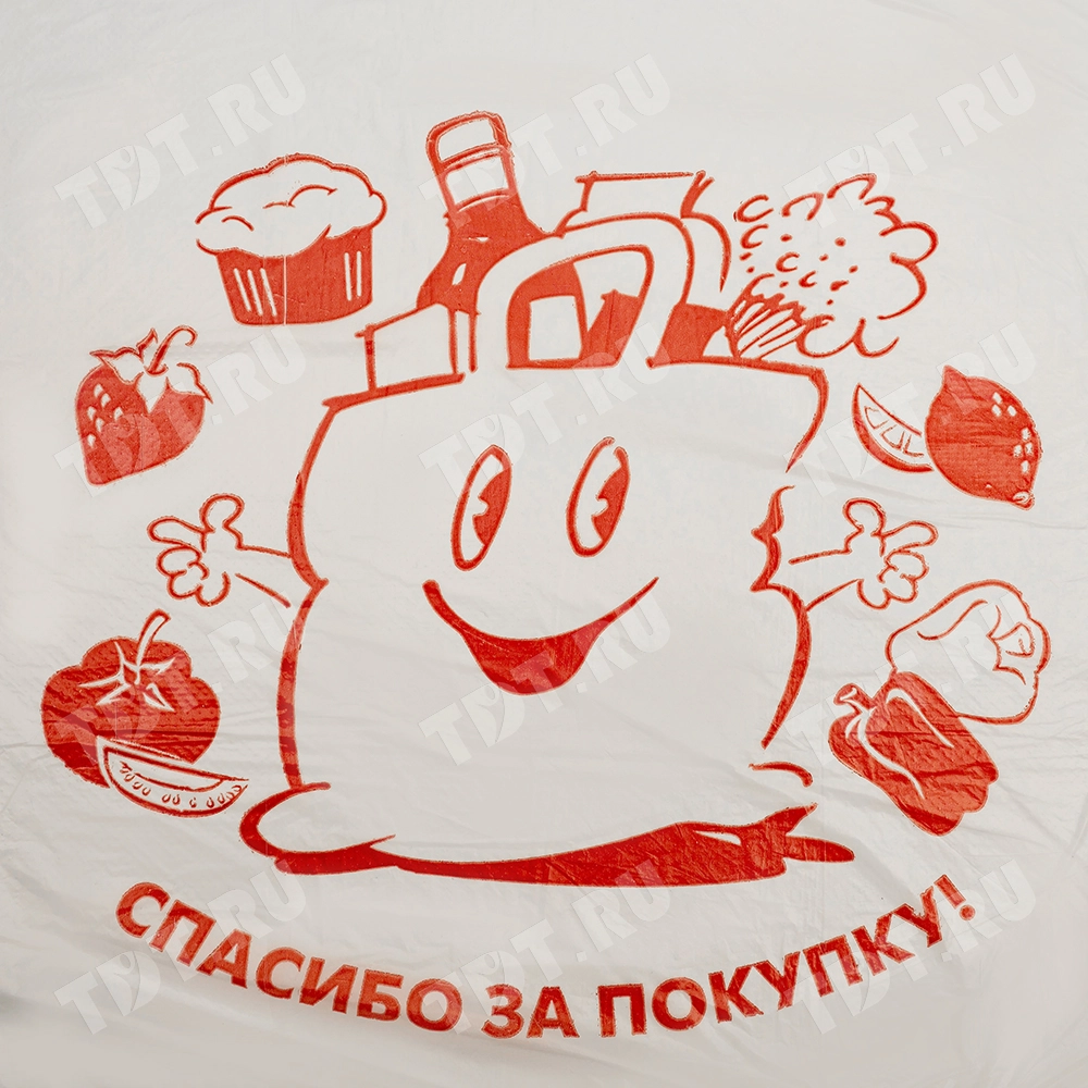 Полиэтиленовые пакеты майка ПНД с надписью «Спасибо за покупку», белого цвета, длиной 50 см, шириной 28+16 см, толщиной 12 мкм, в упаковке 100 штук. Материал – полиэтилен низкого давления. Производятся в России.