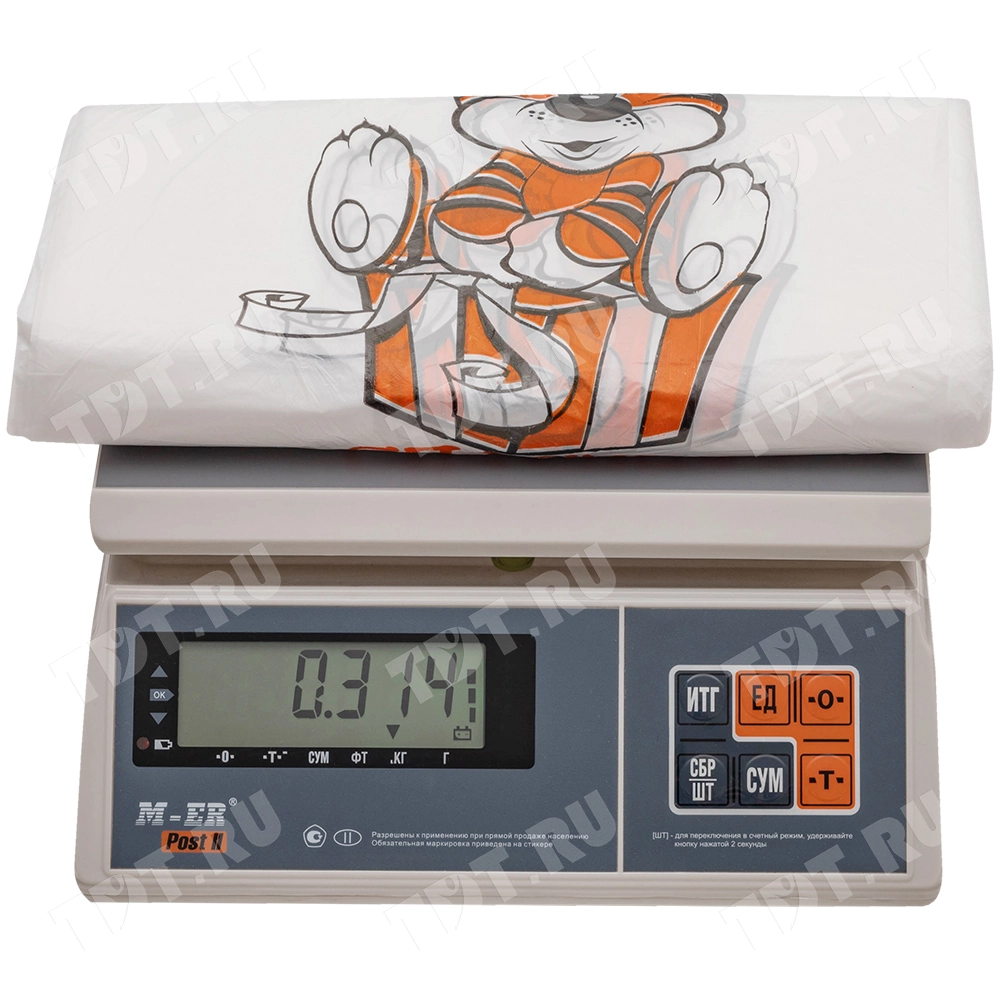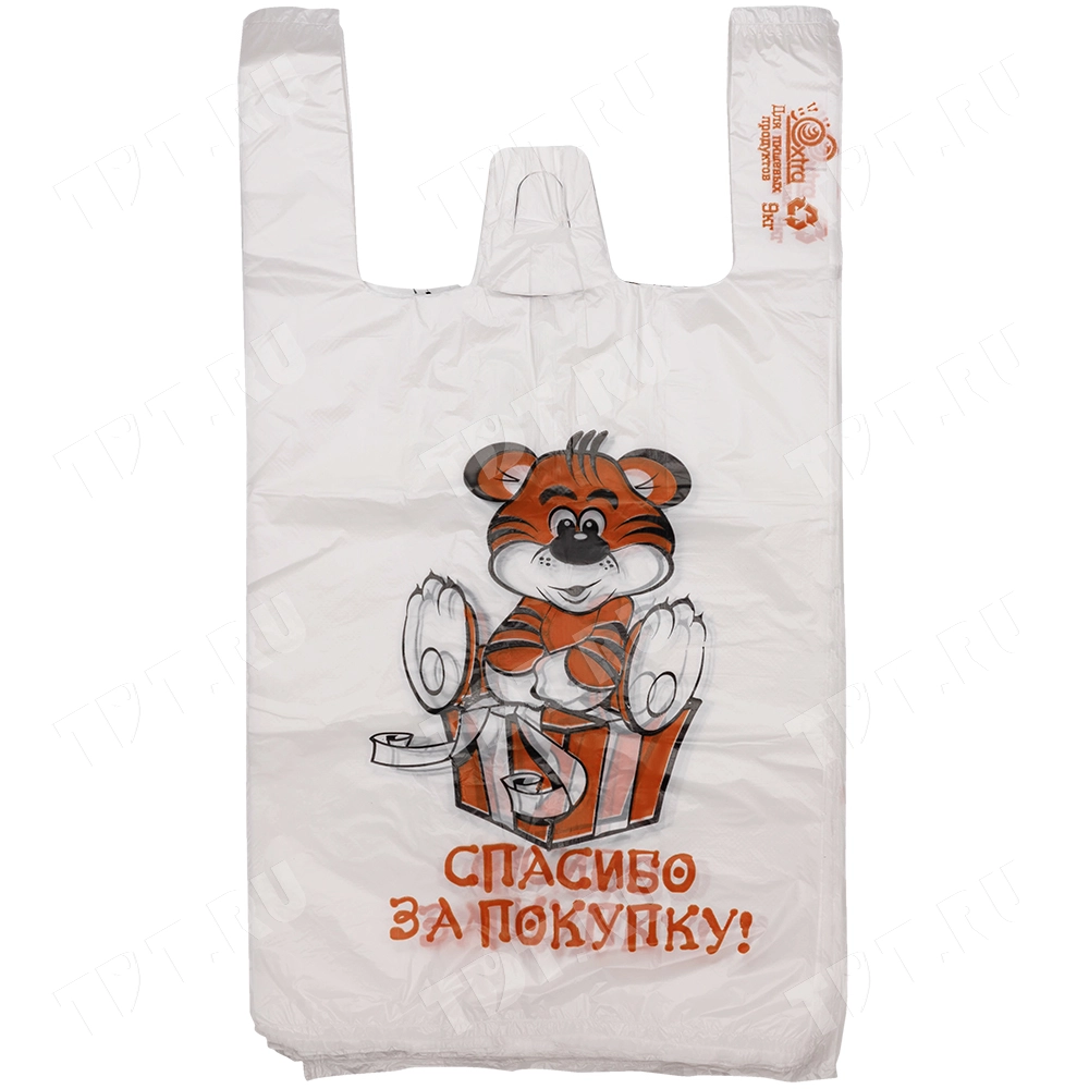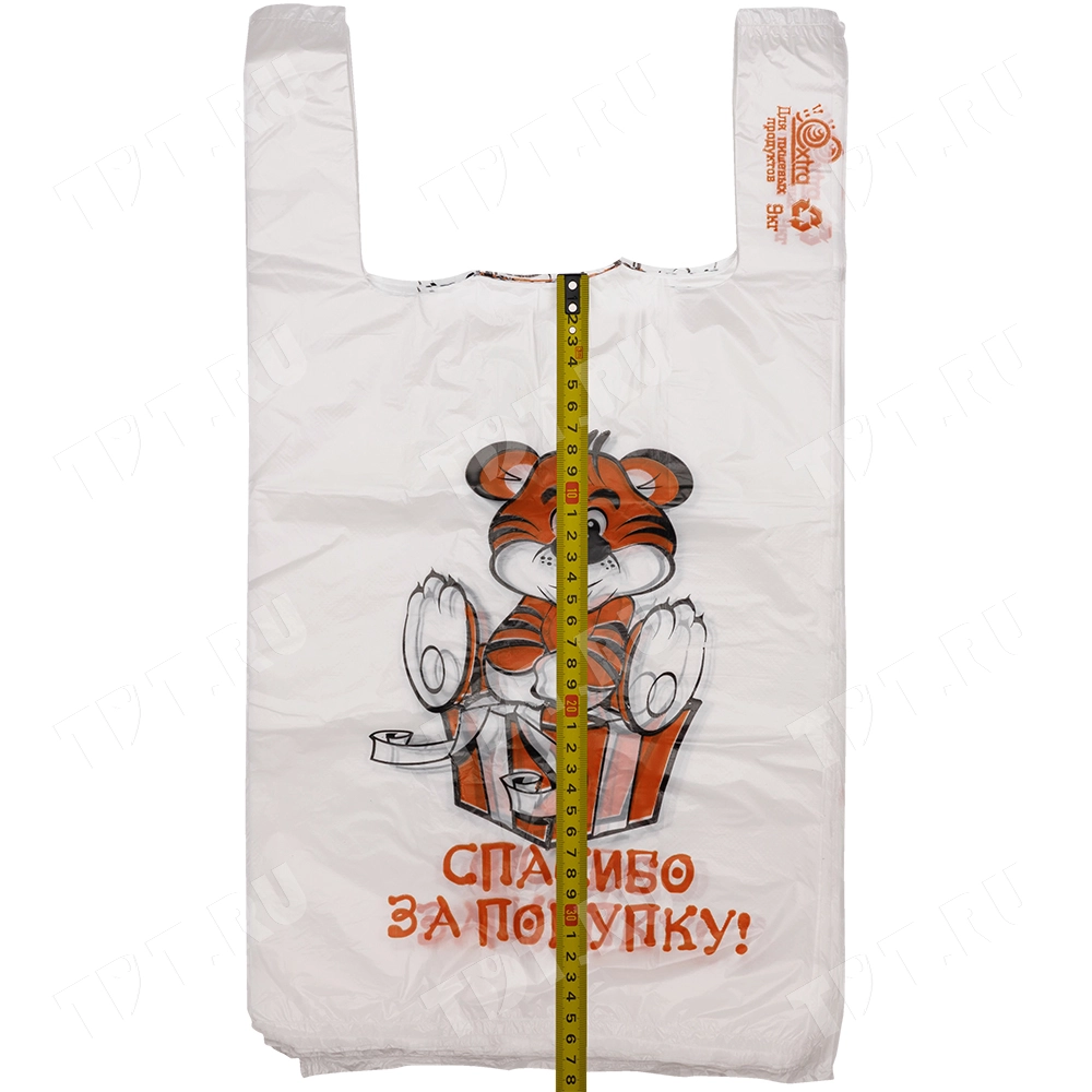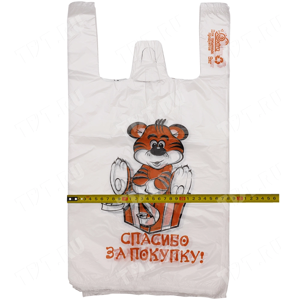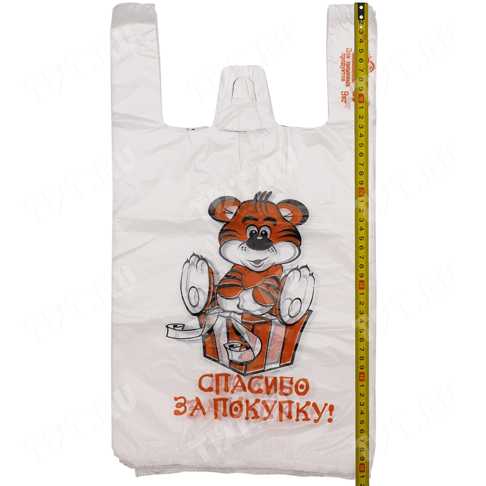 Полиэтиленовые пакеты майка ПНД «Тигренок», с надписью «Спасибо за покупку», белого цвета, длиной 50 см, шириной 28+16 см, толщиной 12 мкм, в упаковке 100 штук. Материал – полиэтилен низкого давления. Производятся в России.