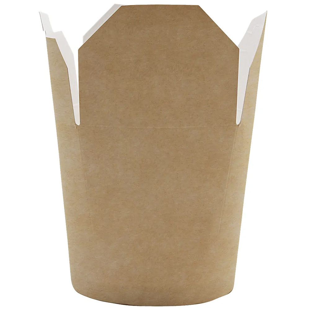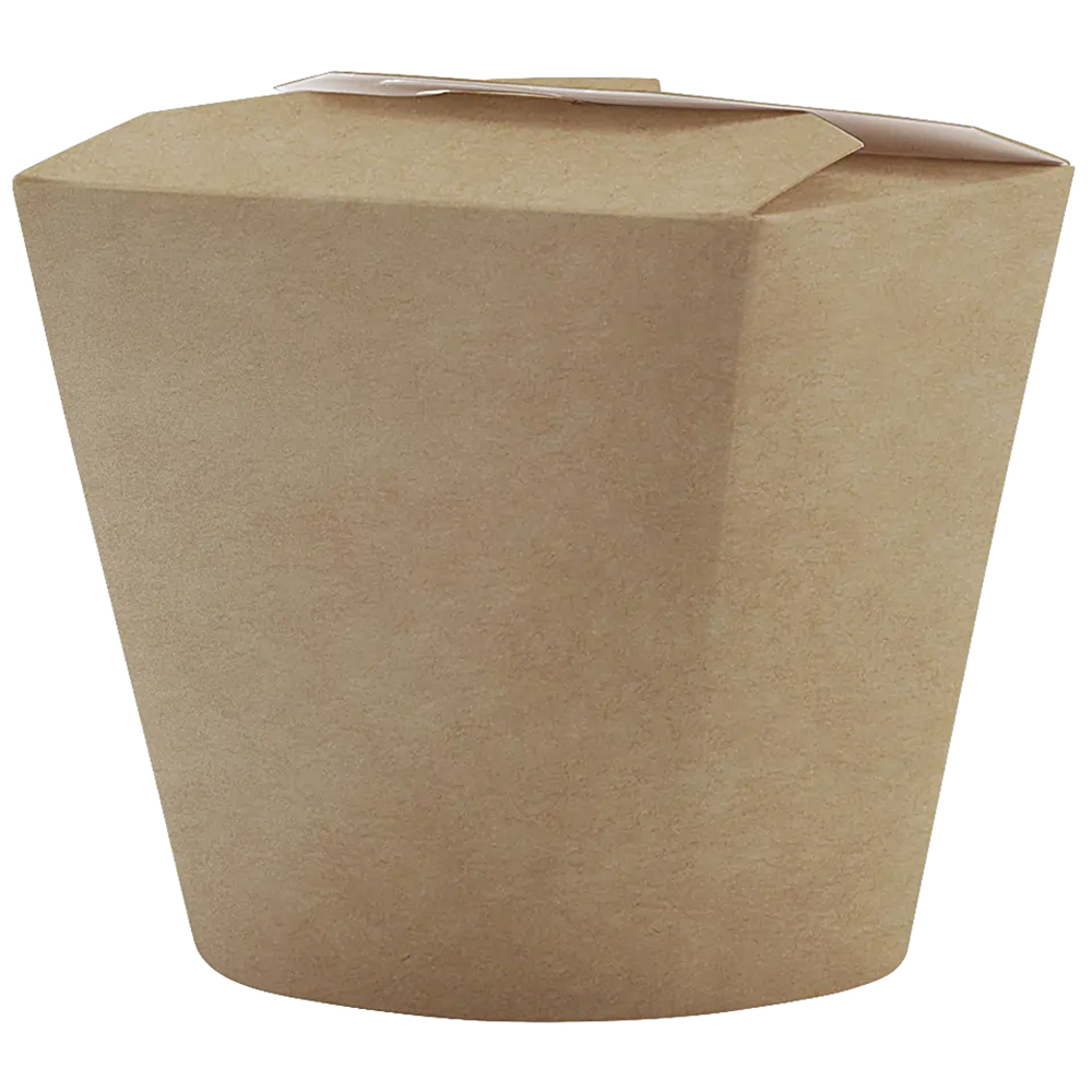Пищевые контейнеры для лапши, объемом 700 мл, бурого и белого цвета, длиной 130 мм, шириной 95 мм, высотой 102 мм, в упаковке по 15 штук. Материал – пищевой картон. Производятся в России.