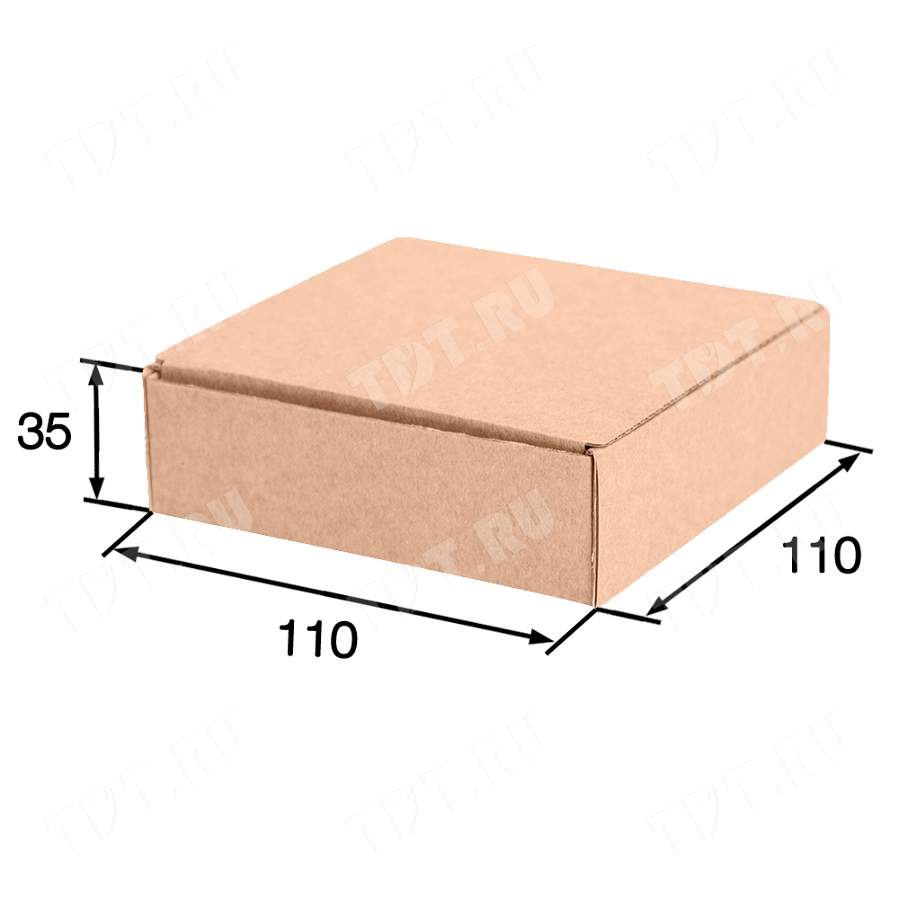 Короб КС-603 МГК, серии КС-600, бурый, длиной 110 мм, шириной 110 мм и высотой 35 мм. Изготовлен из микрогофрокартона Т-23. Полезный объём — 0.4 л.