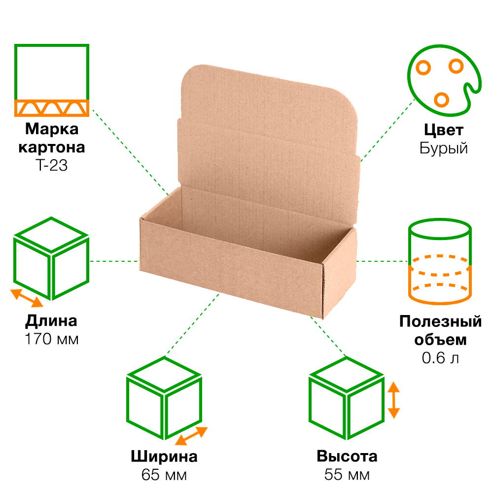 Короб КС-608 МГК, серии КС-600, бурый, длиной 170 мм, шириной 65 мм и высотой 55 мм. Изготовлен из микрогофрокартона Т-23. Полезный объём — 0.6 л.