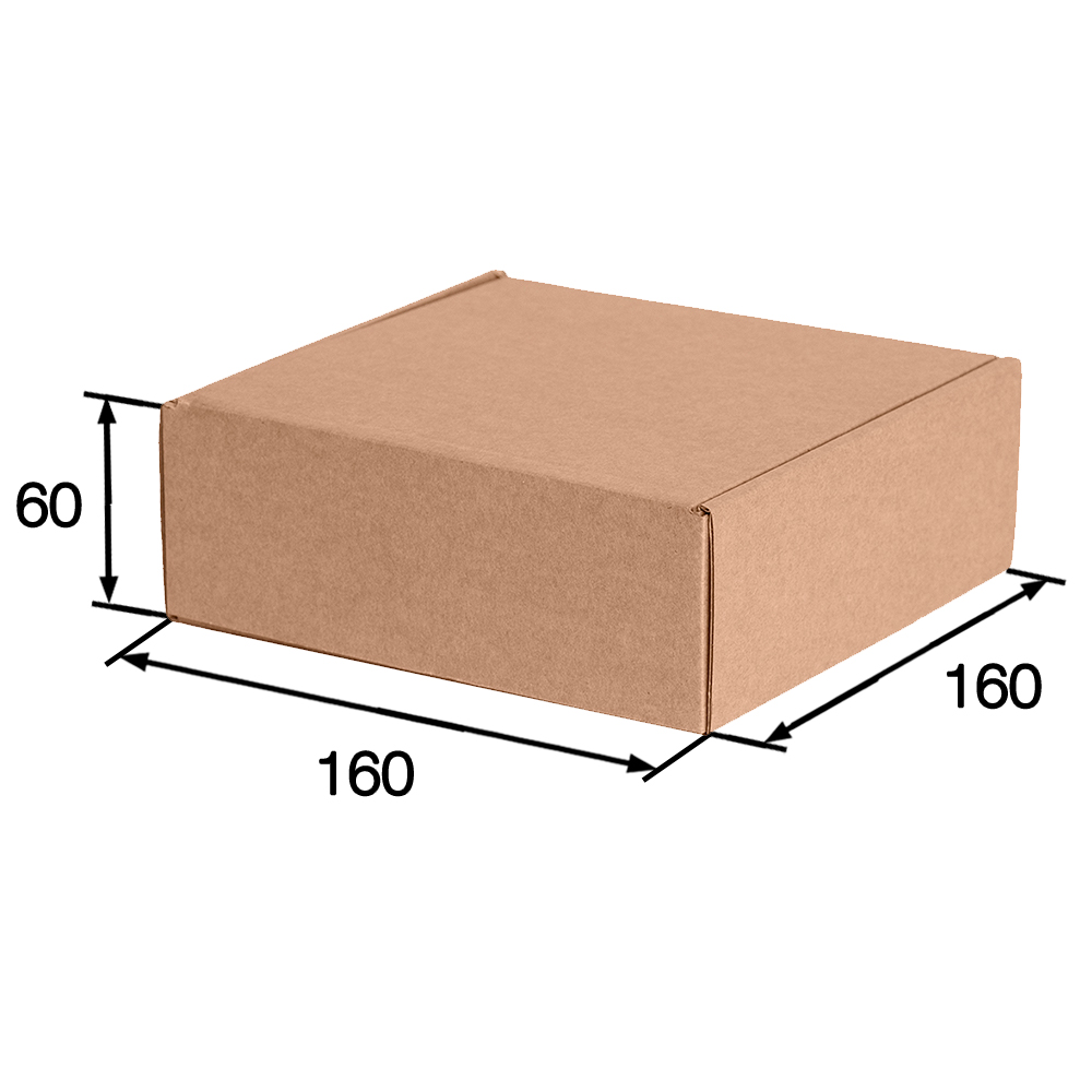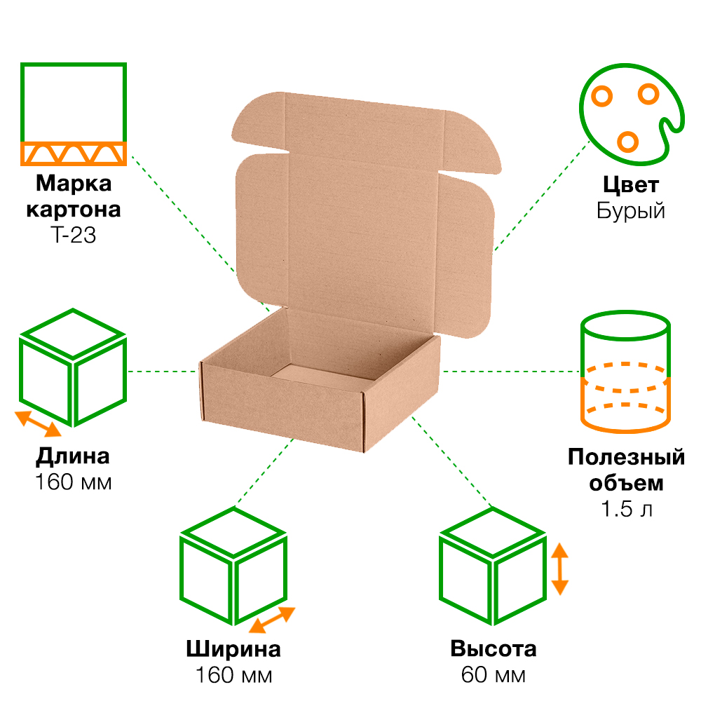 Короб КС-613 МГК, серии КС-600, бурый, длиной 160 мм, шириной 160 мм и высотой 60 мм. Изготовлен из микрогофрокартона Т-23. Полезный объём — 1.5 л.