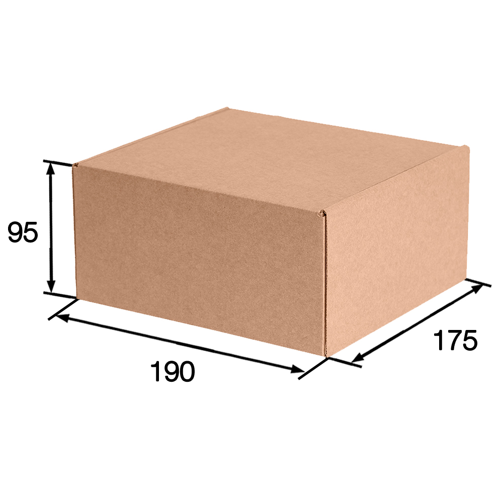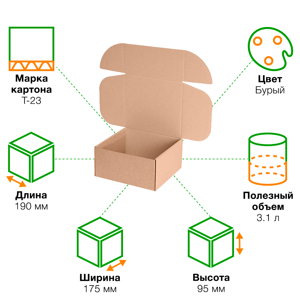 Короб КС-627 МГК, серии КС-600, бурый, длиной 190 мм, шириной 175 мм и высотой 95 мм. Изготовлен из микрогофрокартона Т-23. Полезный объём — 3.1 л.