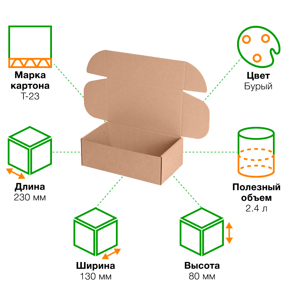 Внутренние размеры 230*130*80 мм. У всех картонных коробок указанны внутренние размеры.