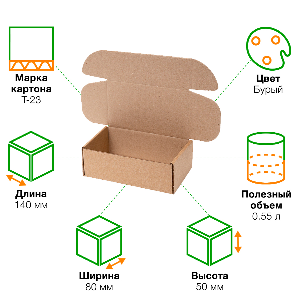 Короб КС-636 МГК, серии КС-600, бурый, длиной 140 мм, шириной 80 мм и высотой 50 мм. Изготовлен из микрогофрокартона Т-23. Полезный объём — 0.55 л.