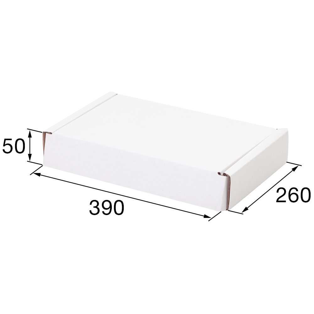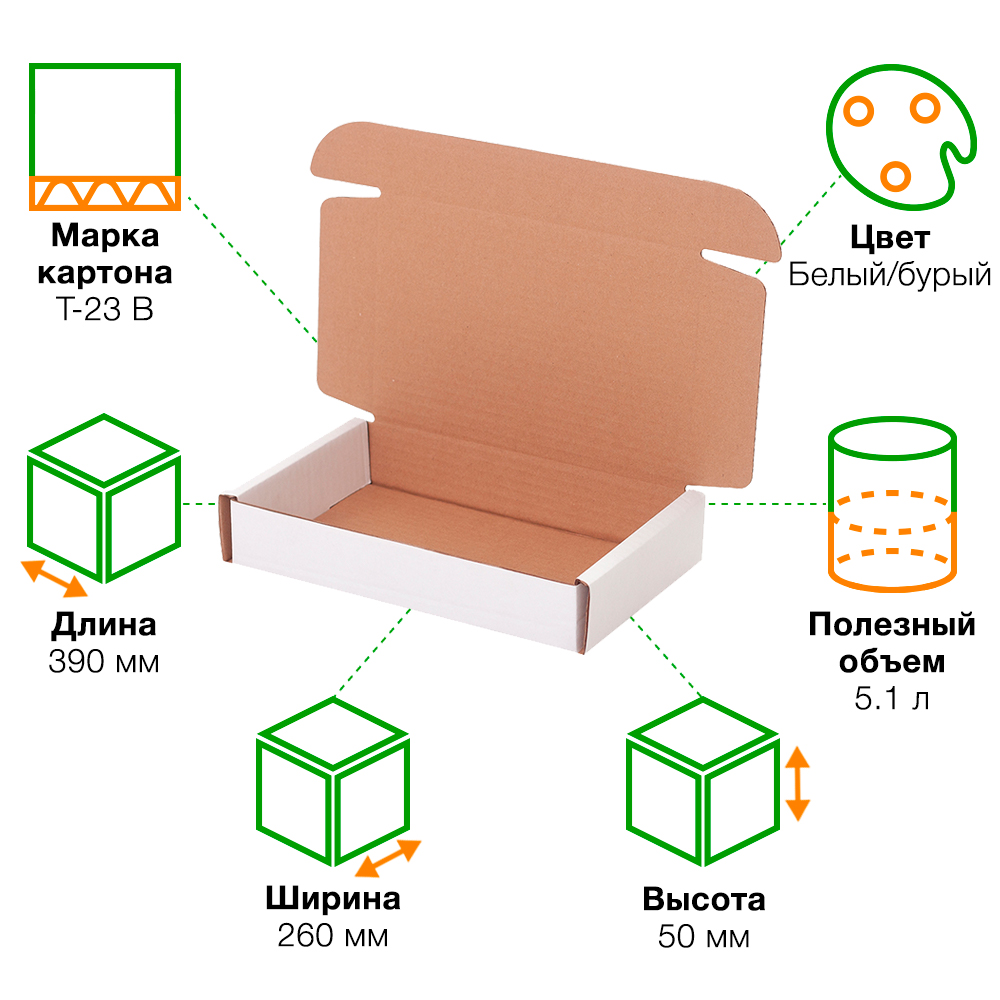 Короб №49/1 белёный, длиной 390 мм, шириной 260 мм и высотой 50 мм. Изготовлен из гофрокартона Т-23 В. Полезный объём — 5.1 л.