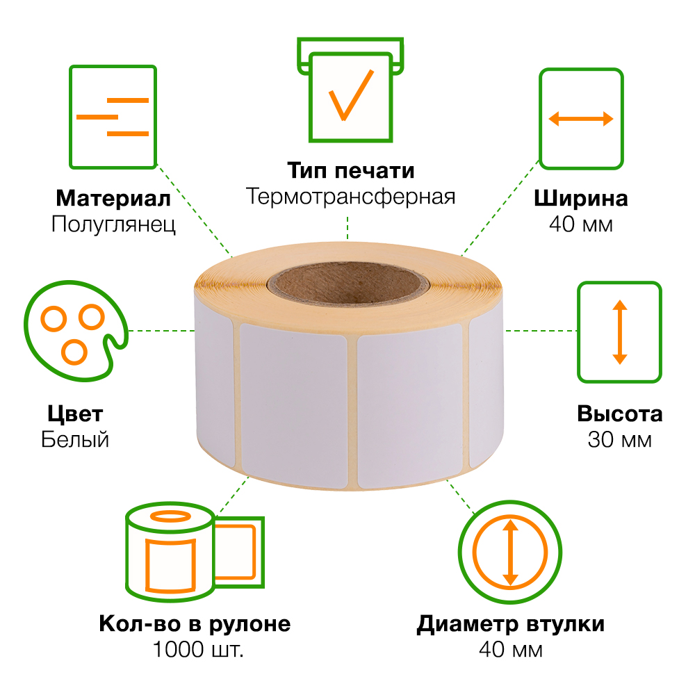 Термотрансферные этикетки ПЛГ из мелованной печатной полуглянцевой бумаги белого цвета, шириной 40 мм, высотой 30 мм, диаметром втулки 40 мм, количеством в рулоне по 1000 штук. Производятся в России. Термоэтикетки ПЛГ в рулонах предназначены для печати на термотрансферном принтере с применением красящей ленты (риббон).