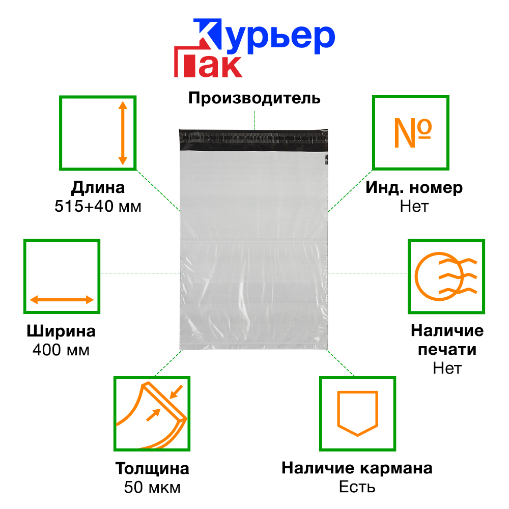 Курьер-пакет белый без печати, с карманом, 400*515+40 мм, 50 мкм, 1 шт.