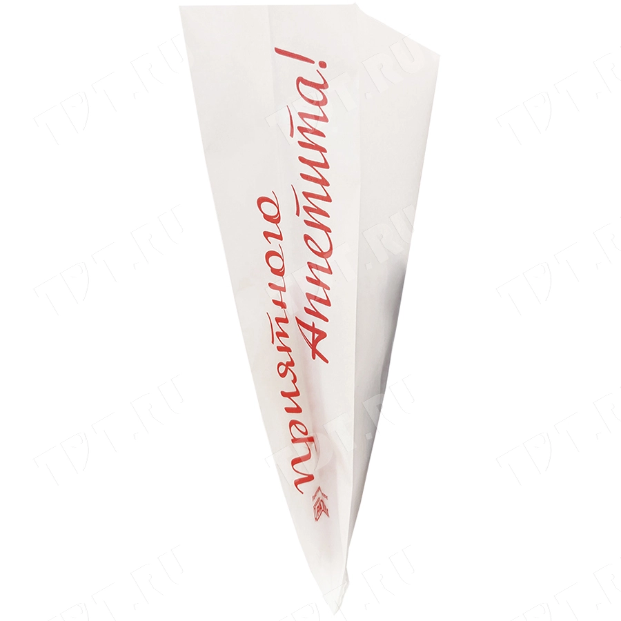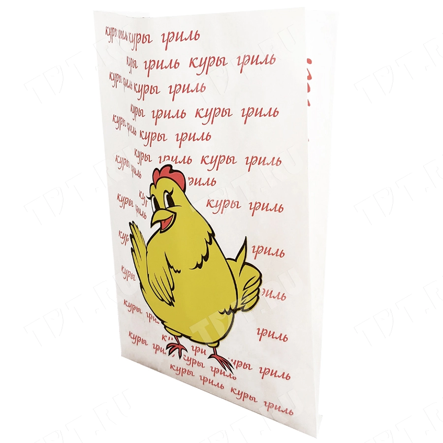 Бумажные пакеты для кур-гриль, с рисунком и надписями, без ручек, белого цвета, высотой 285 мм, шириной 85 мм, в упаковке по 1000 штук. Материал – ламинированная бумага. Производятся в России.