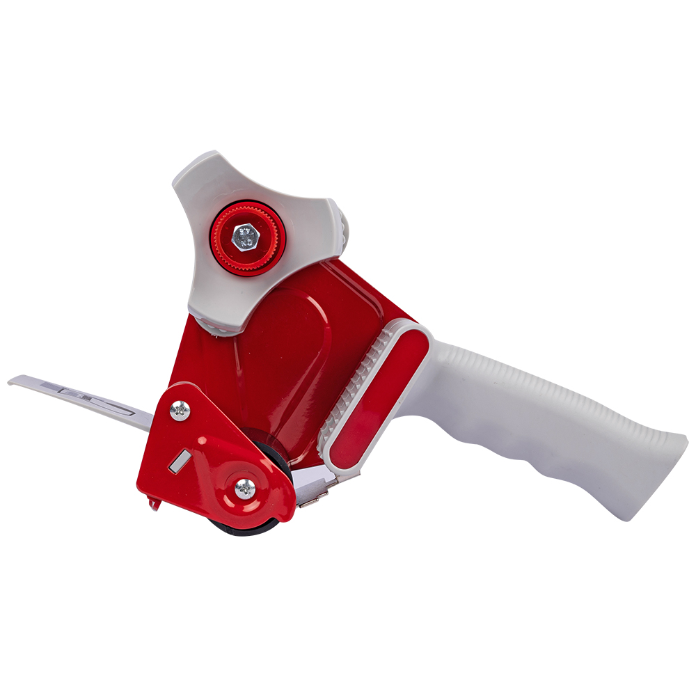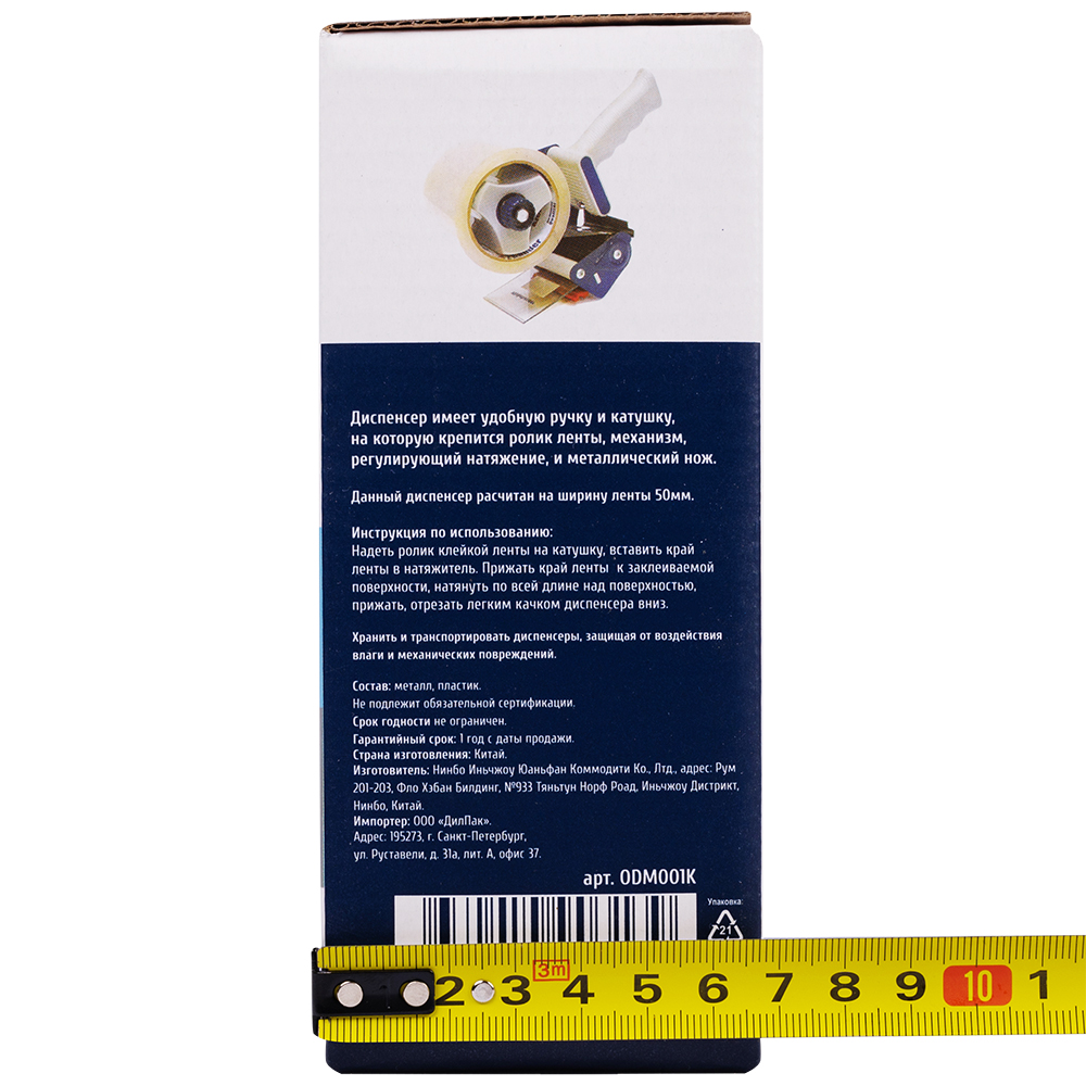 Диспенсер имеет удобную ручку и катушку, на которую крепится ролик ленты, механизм, регулирующий натяжение, и металлический нож.