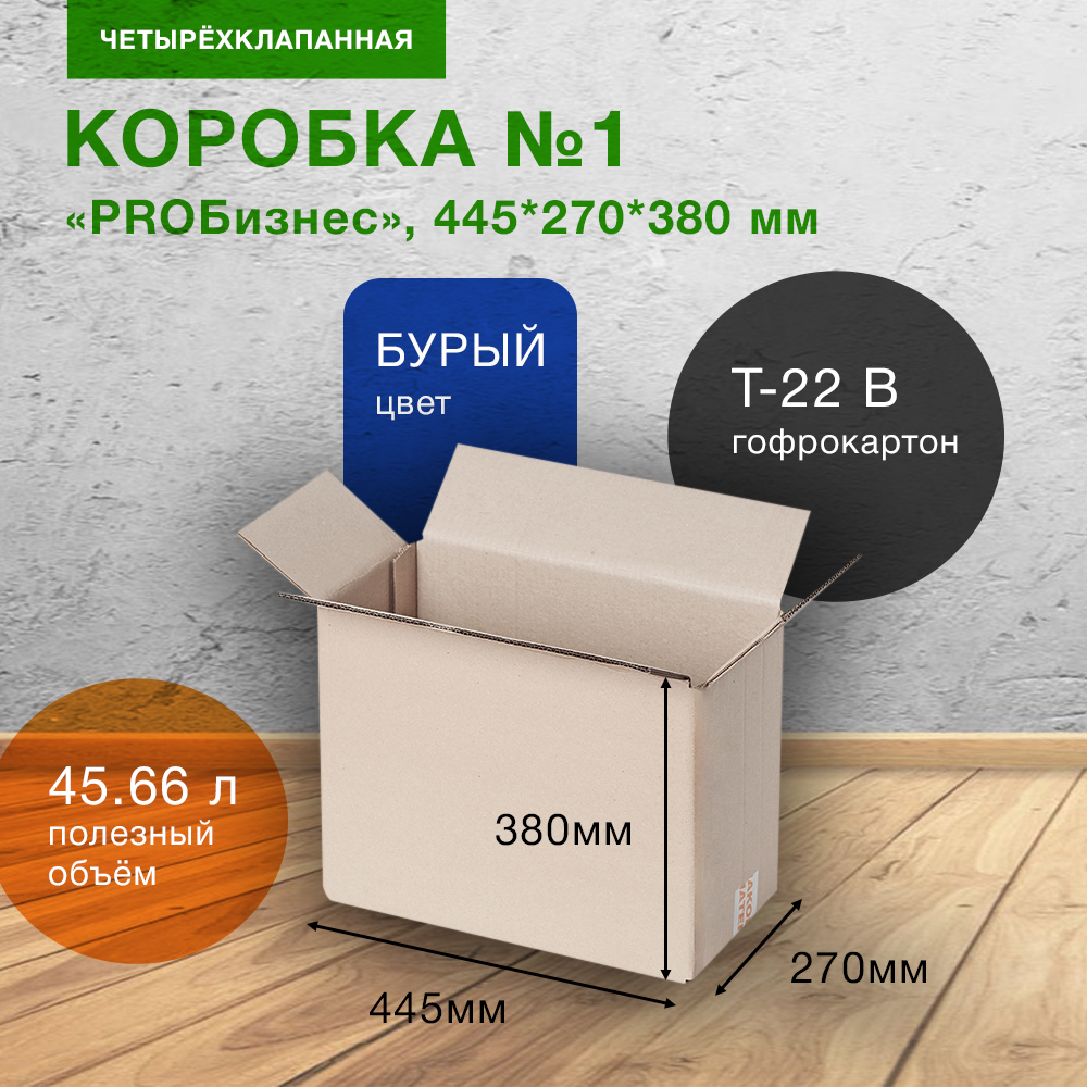 Короб «PROБизнес» №1-МК бурого цвета, длиной 445 мм, шириной 270 мм и высотой 380 мм. Изготовлен из трехслойного картона марки Т-22 В. Полезный объём — 45.66 л.