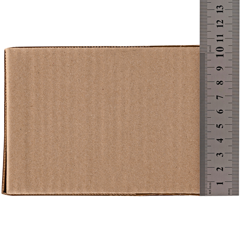 Короб «PROБизнес» №5-МК бурого цвета, длиной 220 мм, шириной 165 мм и высотой 100 мм. Изготовлен из трехслойного картона марки Т-22 В. Полезный объём — 3.63 л.