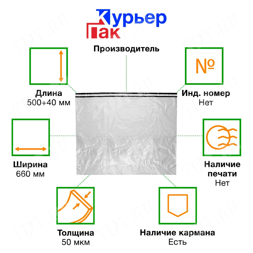 Курьер-пакет белый без печати, с карманом, 660*500+40 мм, 50 мкм, 1 шт.