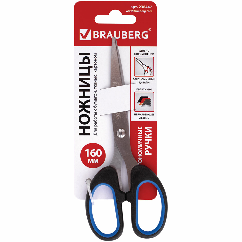 Универсальные ножницы Brauberg «CLASSIC+», код производителя 236447, длина лезвий 160 мм, черно-синего цвета. Материал – нержавеющая сталь. Продаются в картонной упаковке с европодвесом. Производятся в Китае.