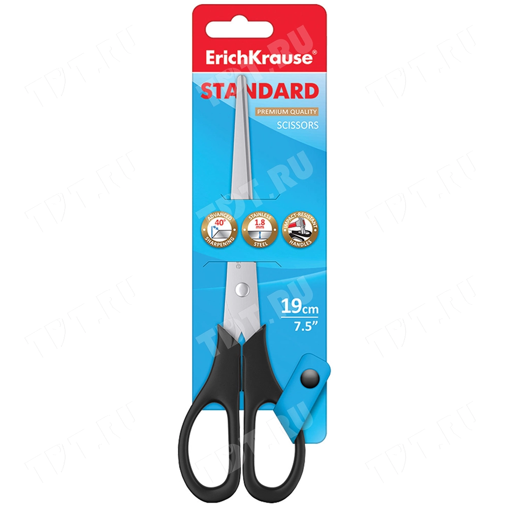 Ножницы Erich Krause «STANDARD», Premium Quality код производителя 21881, длина лезвий 190 мм, черного цвета. Материал – нержавеющая сталь и пластик. Продаются в картонной упаковке с европодвесом. Производятся в Китае.