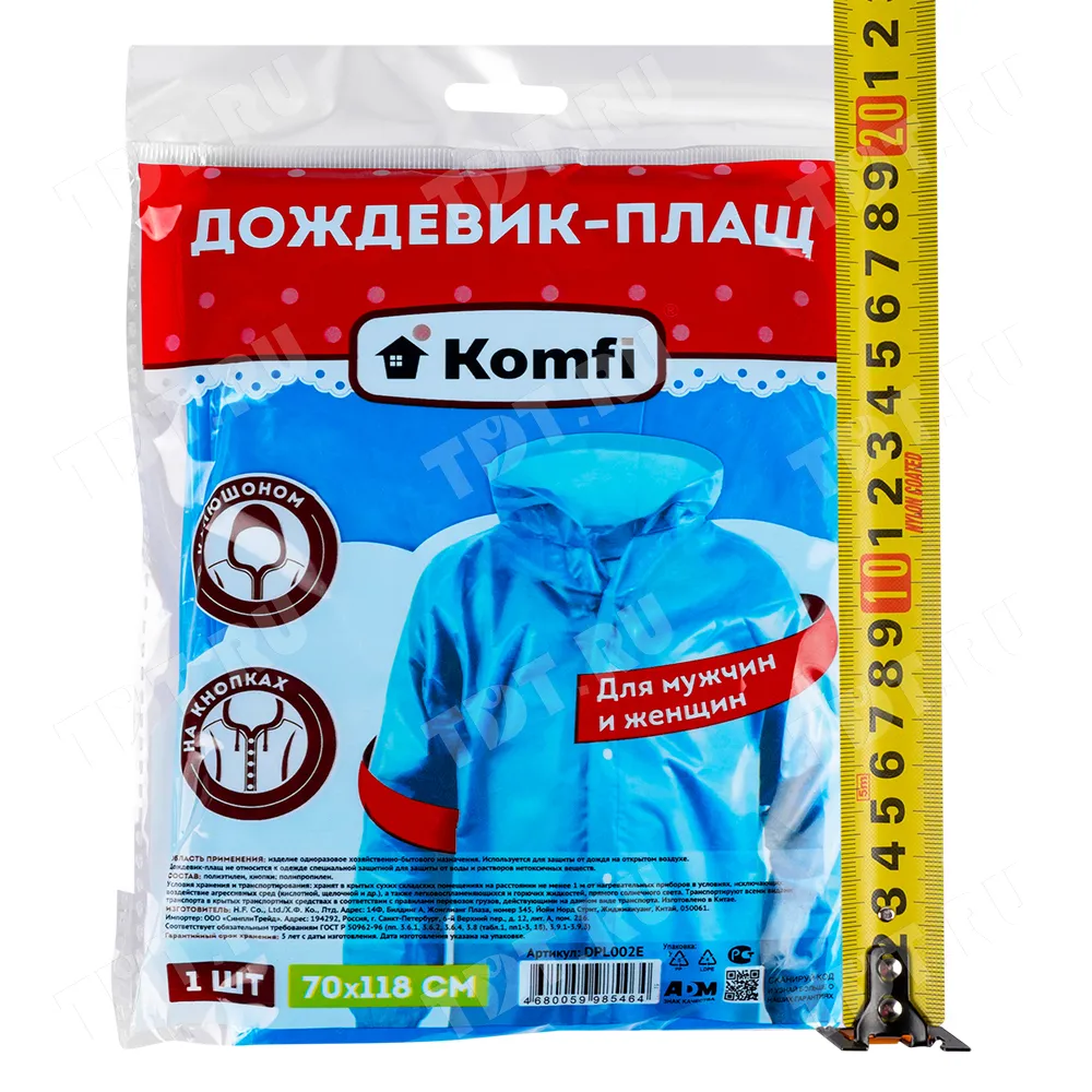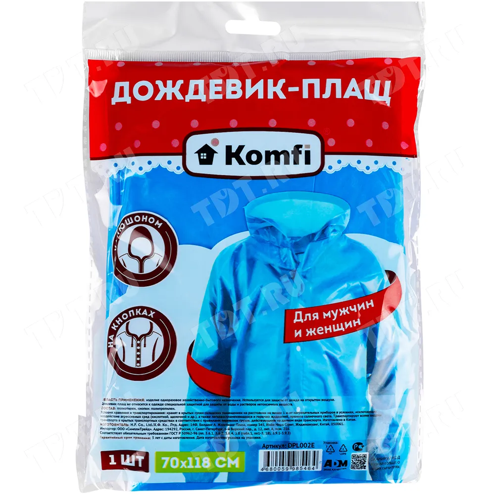 Дождевик-плащ полиэтиленовый Komfi, код производителя 3587, голубого цвета, на кнопках, для мужчин и женщин, длиной 118 см, шириной 70 см, весом 45 г.