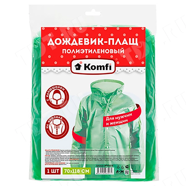 Дождевик-плащ полиэтиленовый Komfi, код производителя 3585, зеленого цвета, на кнопках, для мужчин и женщин, длиной 118 см, шириной 70 см, весом 46 г.