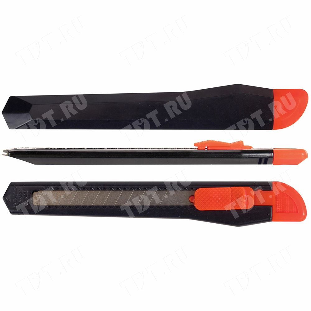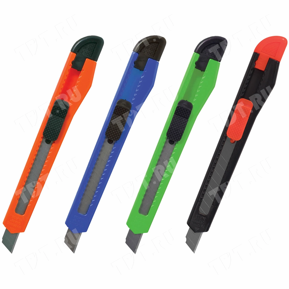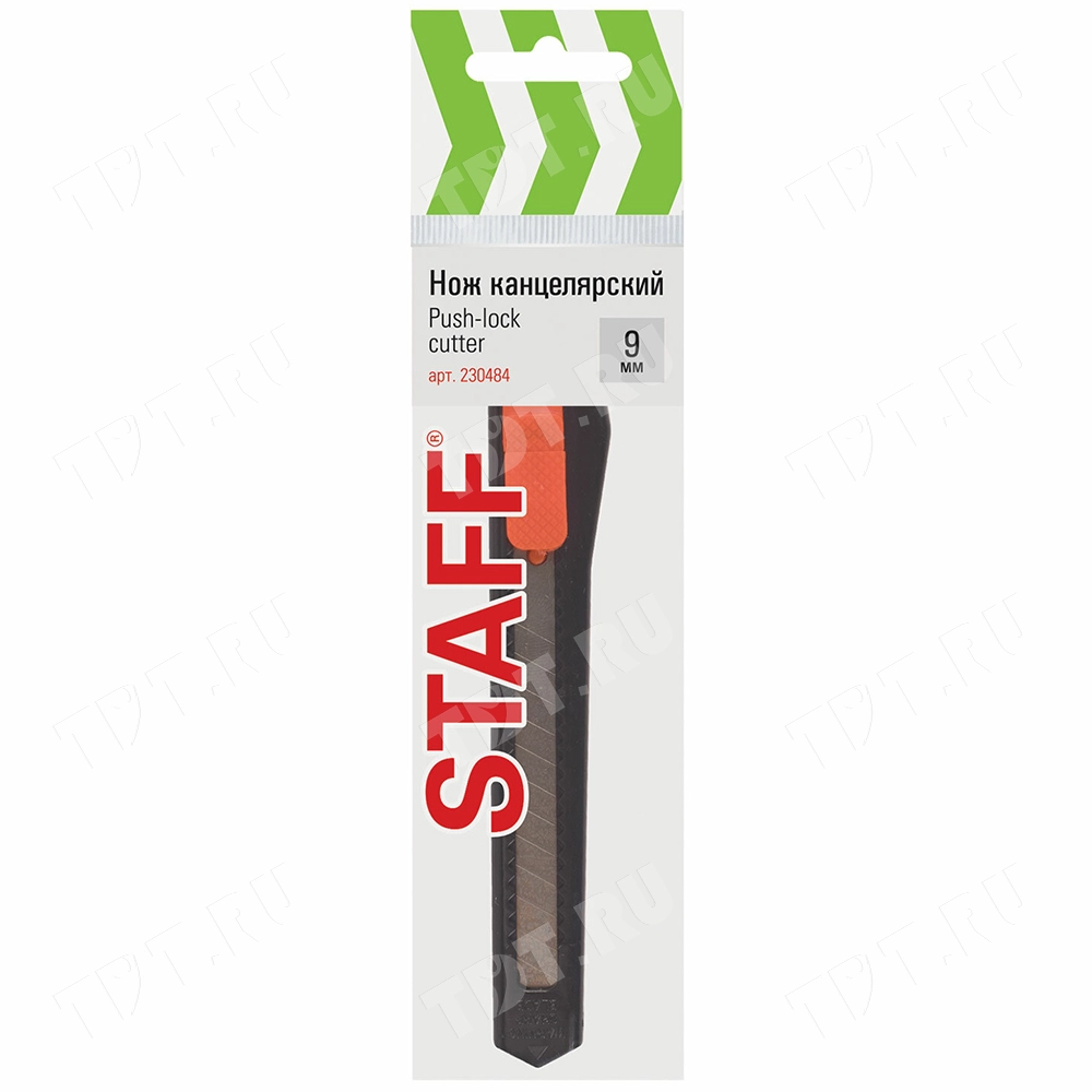 Нож канцелярский STAFF с отламываемым лезвием, код производителя 230484, Push-lock cutter, шириной 9 мм. Материал – пластик. Производится в Китае.