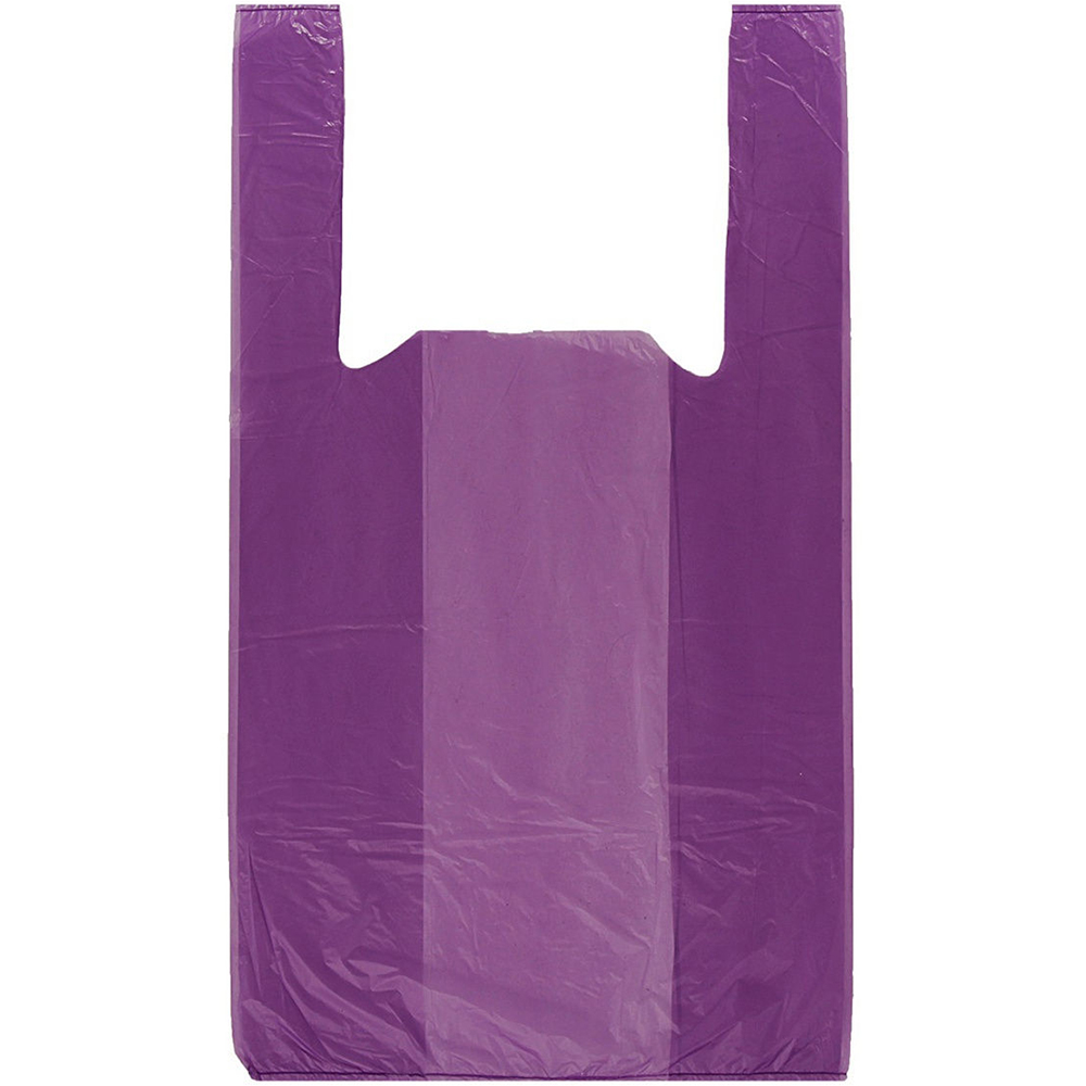 Полиэтиленовые пакеты майка ПНД без надписей, фиолетового цвета, длиной 50 см, шириной 28+14 см, толщиной 10 мкм, в упаковке 100 штук. Материал – полиэтилен низкого давления. Производятся в России.