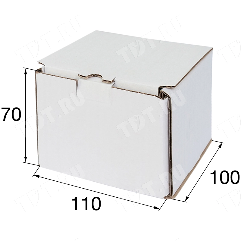 Короб №199/1 (премиум) белёный, длиной 110 мм, шириной 100 мм и высотой 70 мм. Изготовлен из микрогофрокартона Е-22. Полезный объём — 0.77 л.