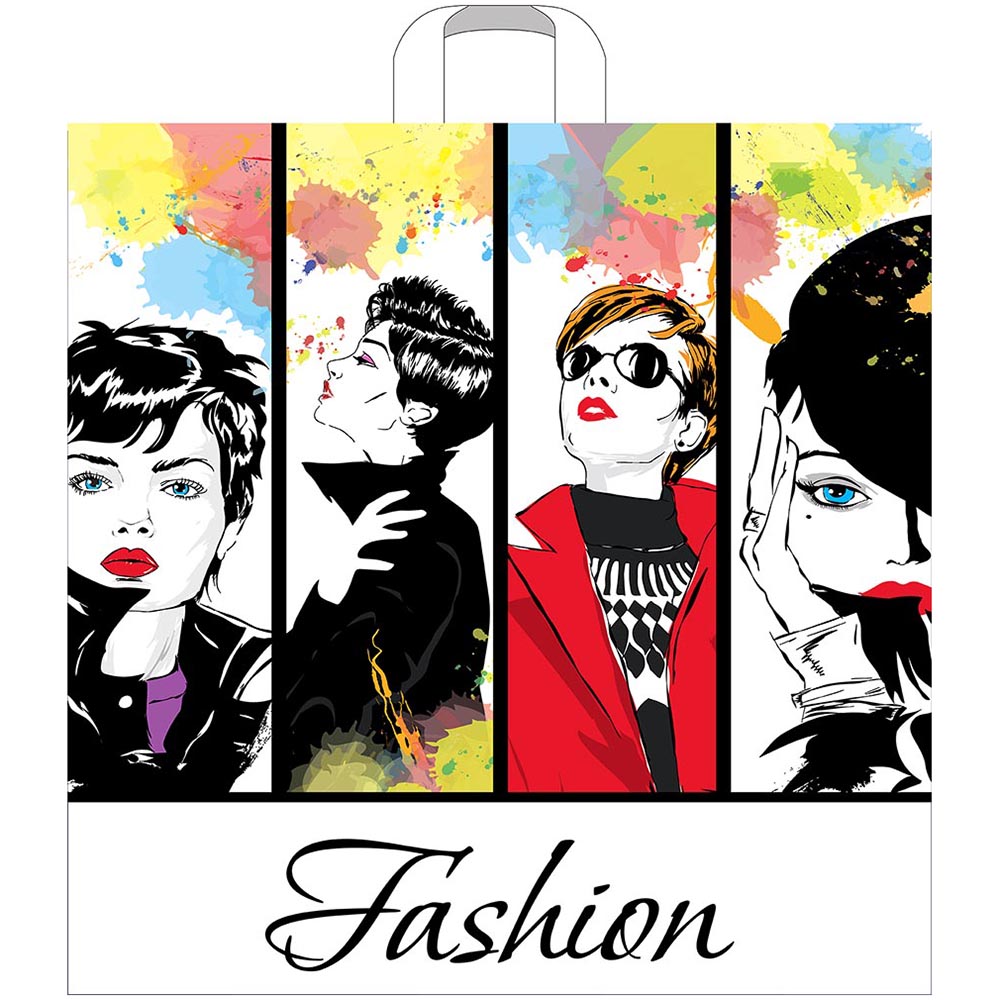 Полиэтиленовые пакеты ПВД с петлевой ручкой «Fashion» с рисунком, размером 55*55+4 см, толщиной 60 мкм, в упаковке 25 штук. Материал – полиэтилен высокого давления. Производятся в России.