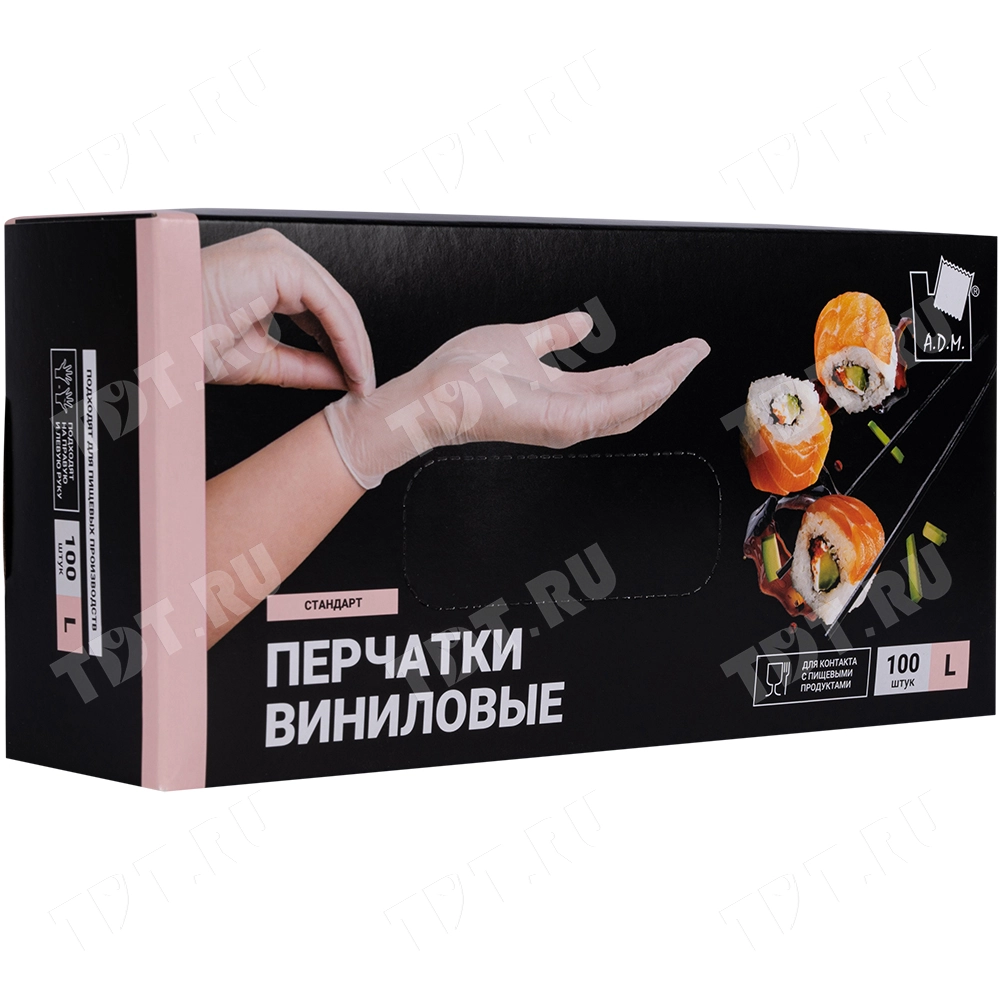 Перчатки виниловые A.D.M., белые, размер L, 100 шт./уп.
