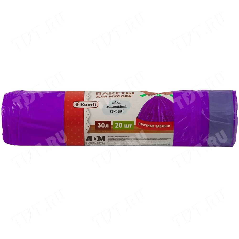 Мешки для мусора Komfi ПНД с прочными завязками, код производителя 30471, фиолетового цвета, объемом 30 л, длиной 58 см, шириной 48 см, толщиной 10 мкм, в упаковке по 20 штук. Выдерживают вес груза до 9 кг. Изготовлены из полиэтилена низкого давления (ПНД).