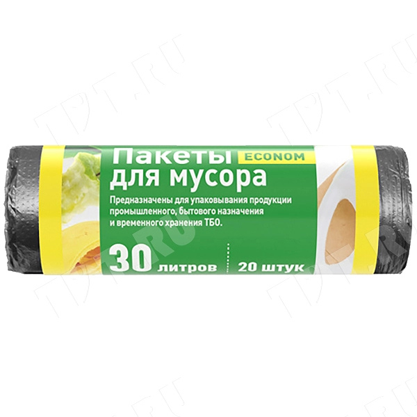 Мешки для мусора Econom ПНД, код производителя 30477, черного цвета, объемом 30 л, длиной 54 см, шириной 48 см, толщиной 5 мкм, в упаковке по 20 штук. Выдерживают вес груза до 5 кг. Изготовлены из полиэтилена низкого давления (ПНД).