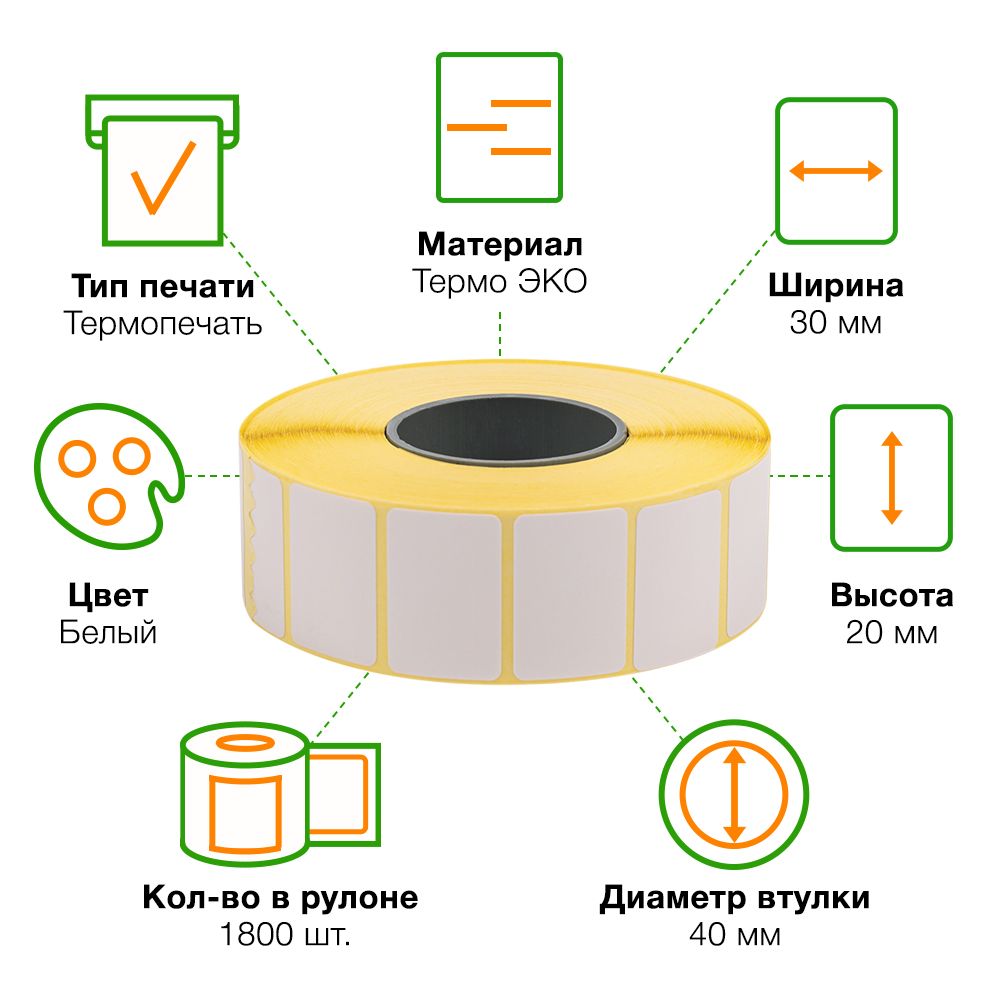 Самоклеящиеся этикетки ЭКО из матовой бумаги белого цвета, шириной 30 мм, высотой 20 мм, диаметром втулки 40 мм, количеством в рулоне по 1800 штук. Производятся в России. Термоэтикетки ЭКО в рулонах предназначены для печати на принтерах без риббона. На этикетках есть специальный слой, который при нагреве термоголовки принтера темнеет, за счет этого происходит печать.