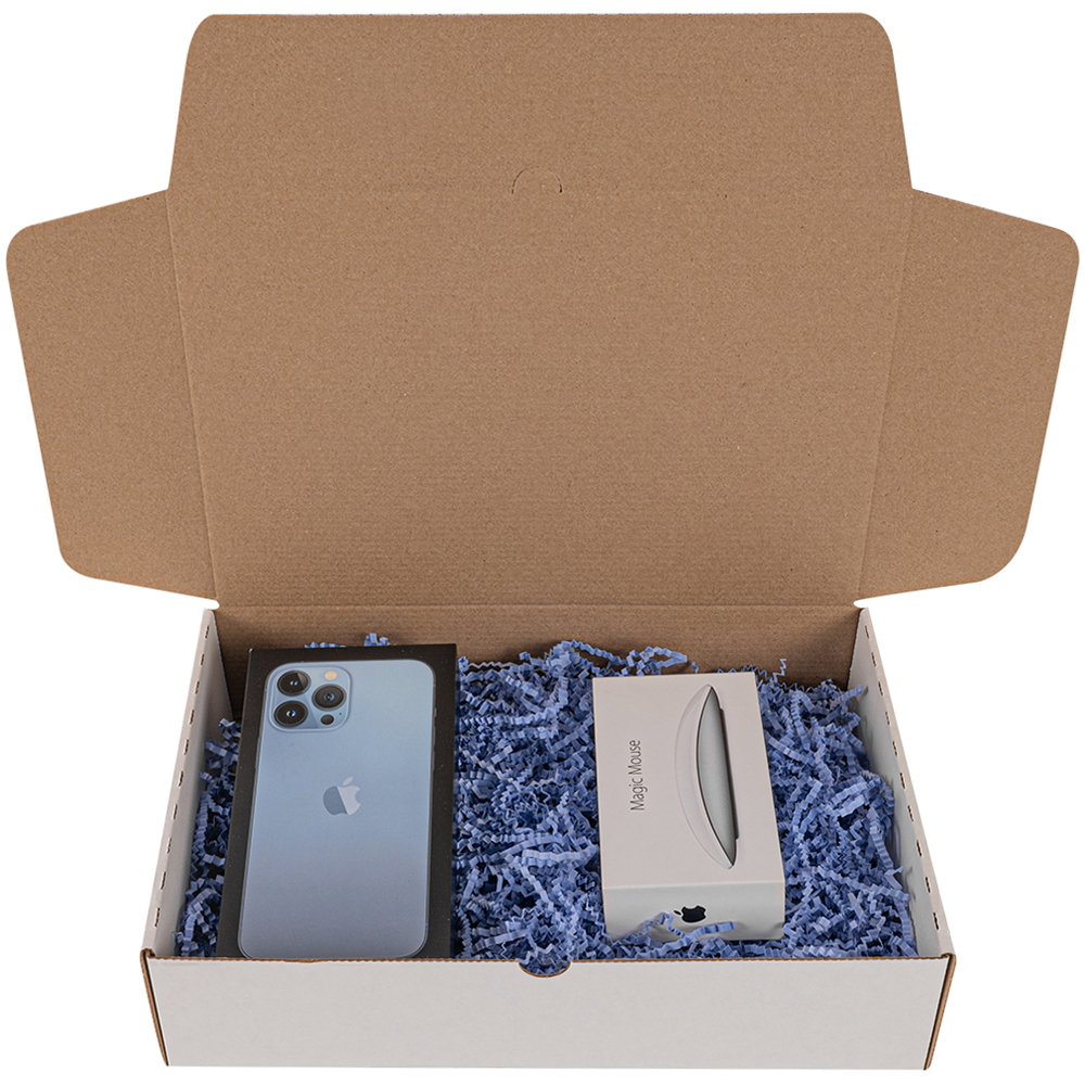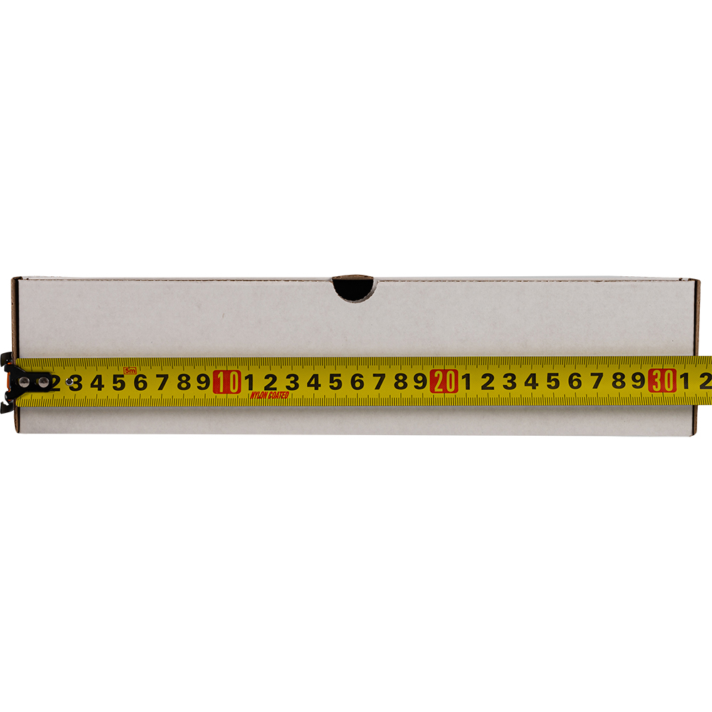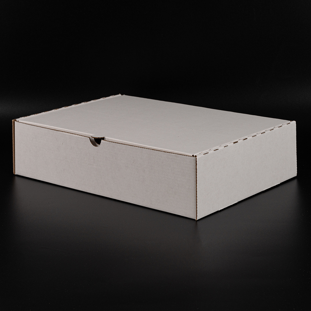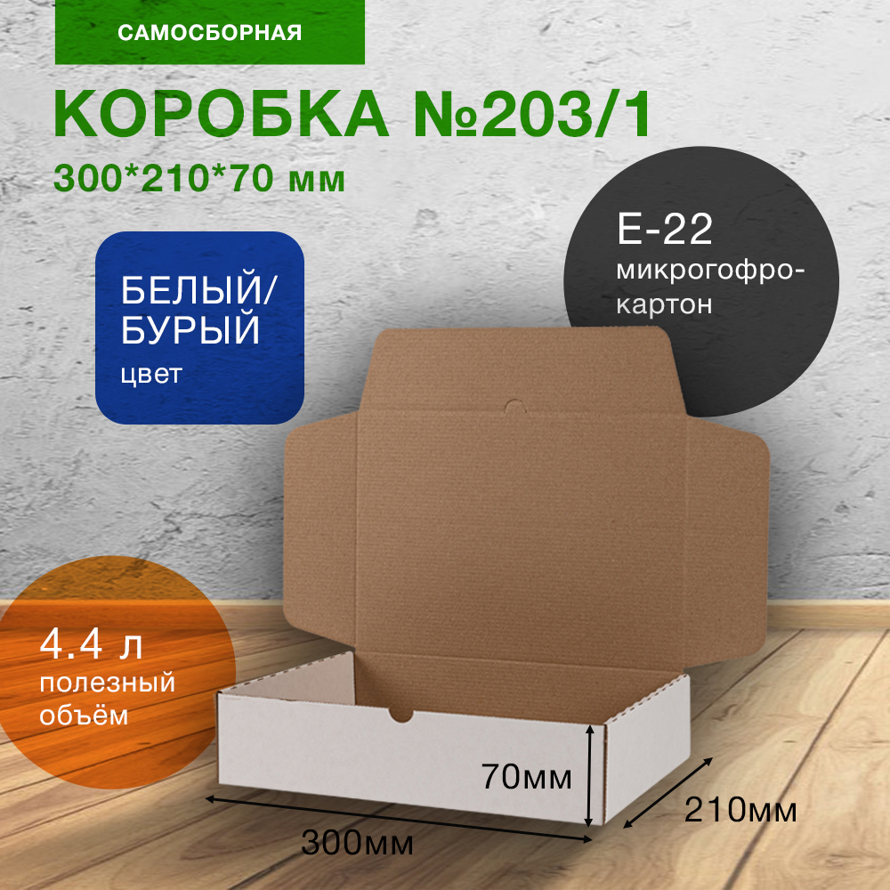 Короб №203/1 (премиум) белёный, длиной 300 мм, шириной 210 мм и высотой 70 мм. Изготовлен из микрогофрокартона Е-22. Полезный объём — 4.4 л.