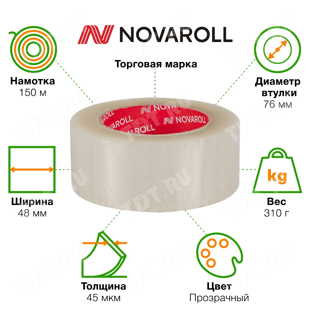 Клейкая лента Nova Roll прозрачная шириной 48 мм, диаметром втулки 76 мм, намоткой 150 метров, толщиной 45 мкм для ручной упаковки.