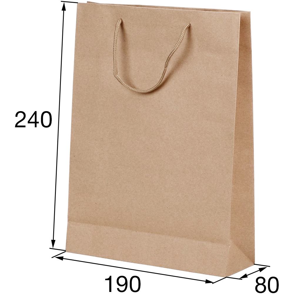 Крафт пакет бурого цвета с верёвочными ручками шириной 190 мм, длиной 80 мм, высотой 240 мм и плотностью 120 г/м².