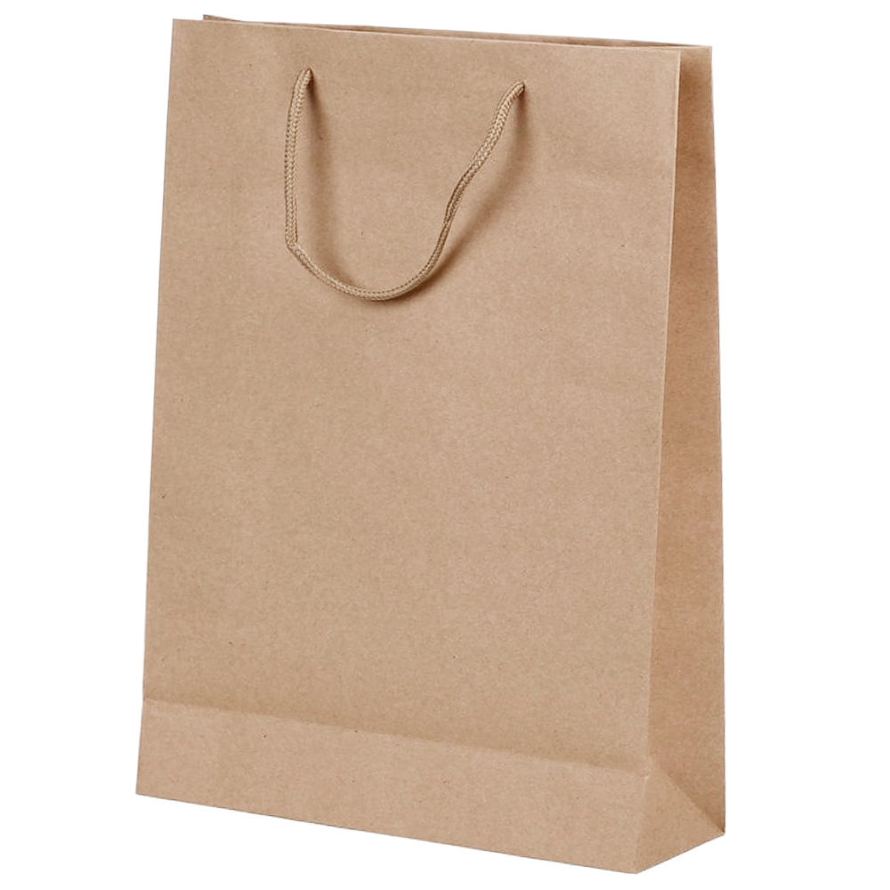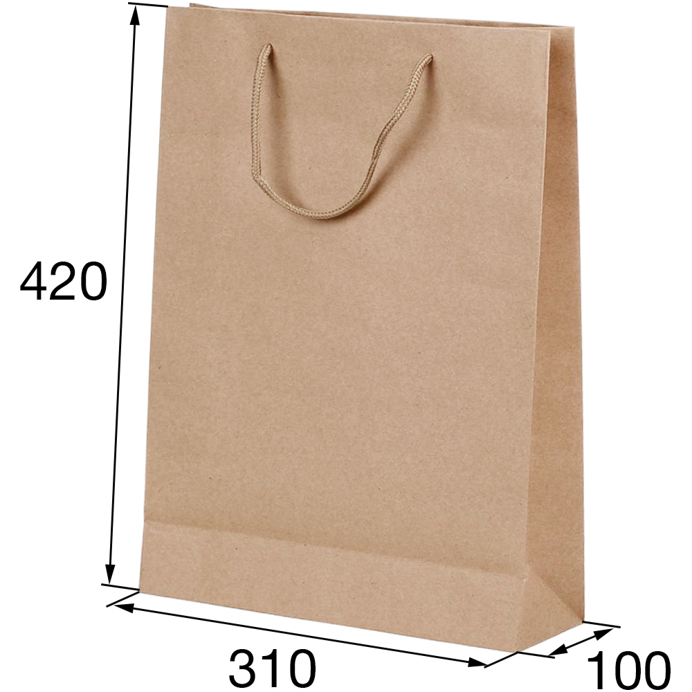 Крафт пакет бурого цвета с верёвочными ручками шириной 310 мм, длиной 100 мм, высотой 420 мм и плотностью 120 г/м².