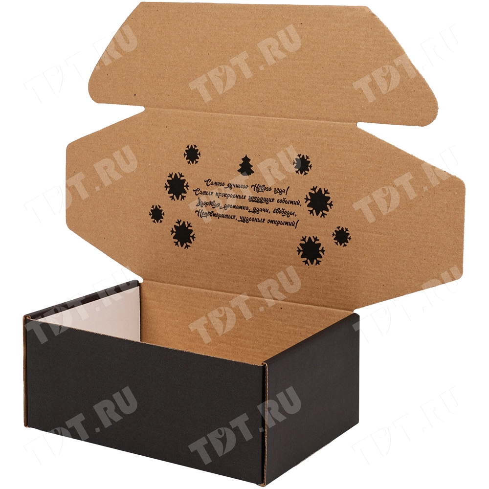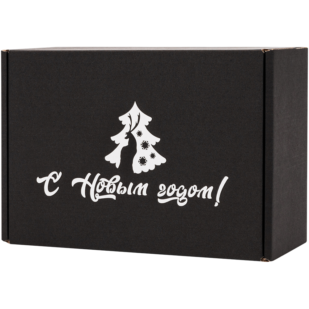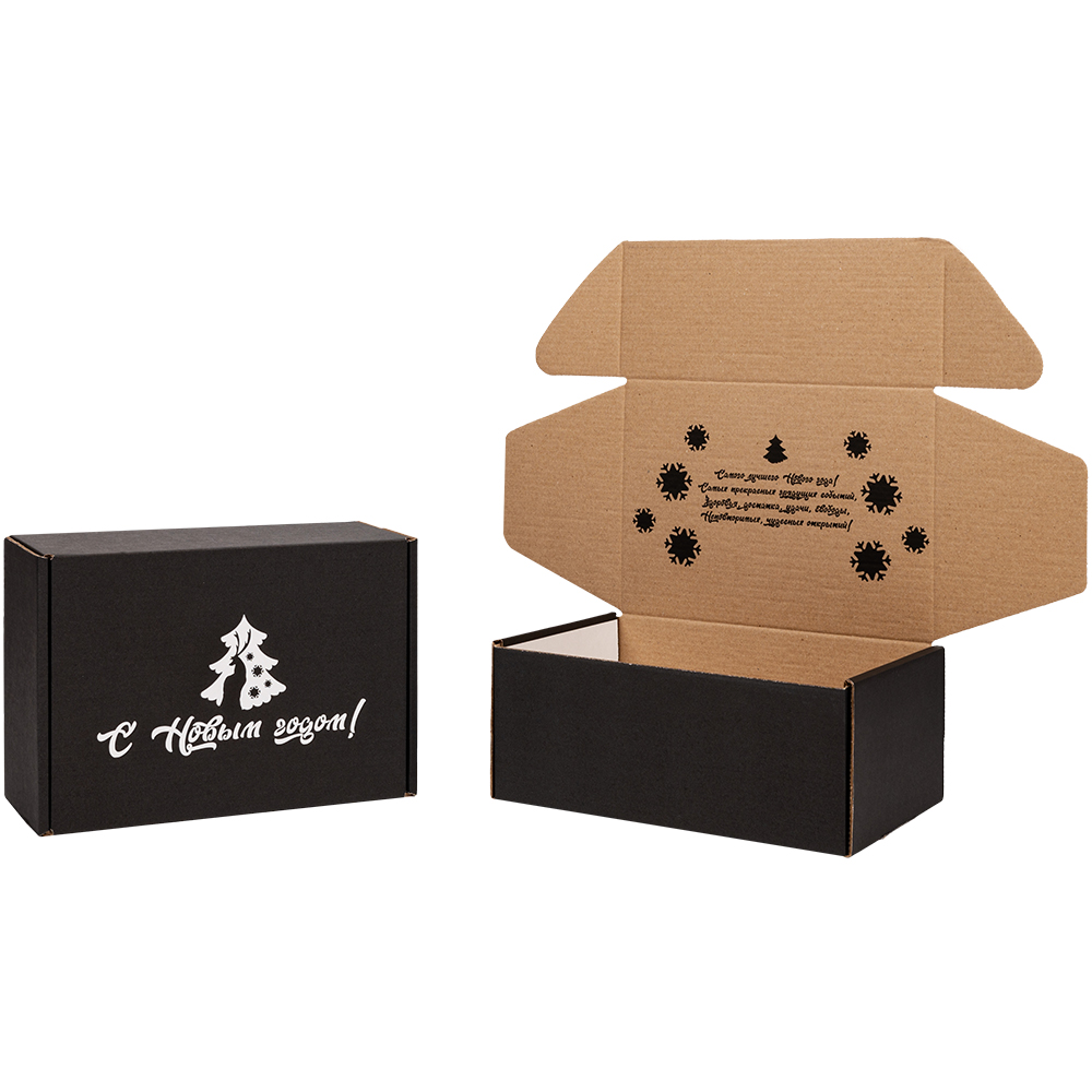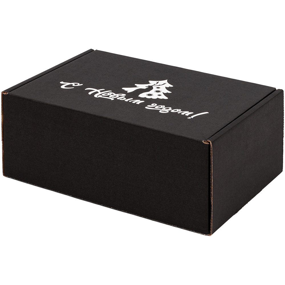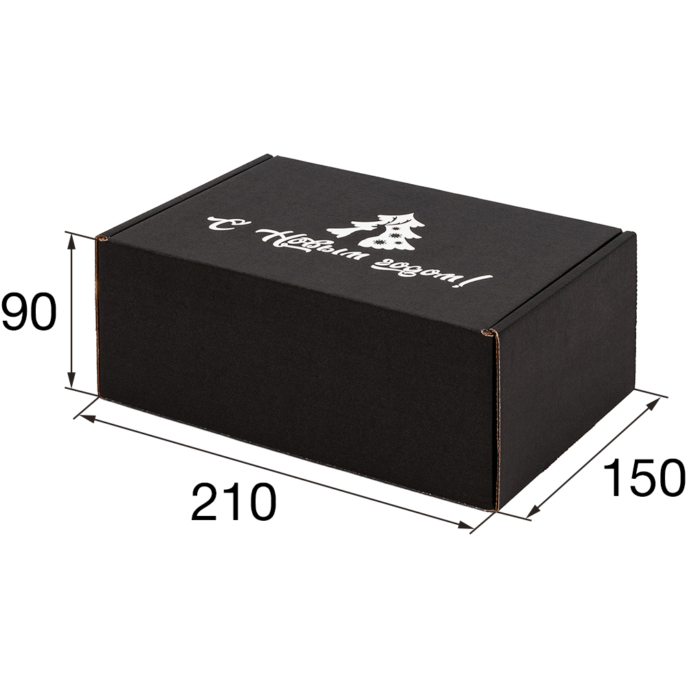 Подарочная коробка «С Новым годом!» чёрная, с поздравительной надписью, длиной 210 мм, шириной 150 мм и высотой 90 мм. Изготовлена из микрогофрокартона Е-22. Полезный объём — 2.83 л.