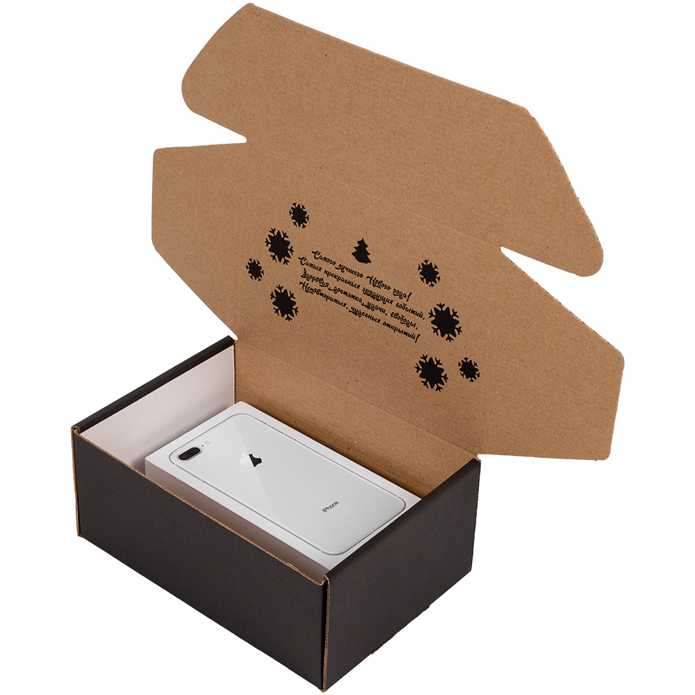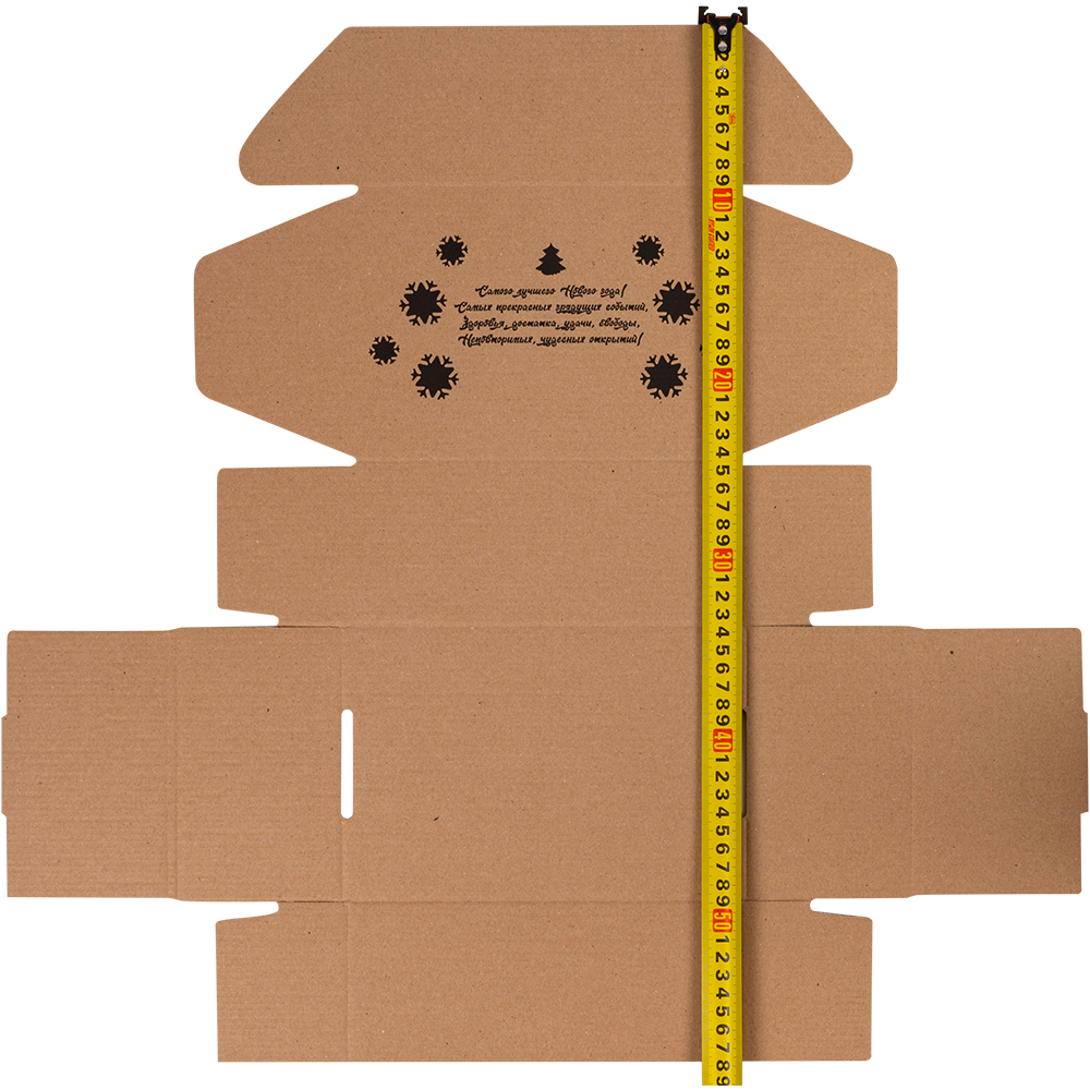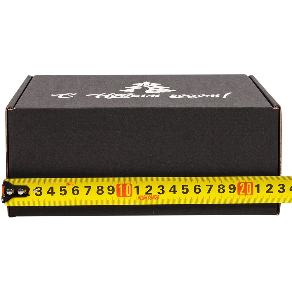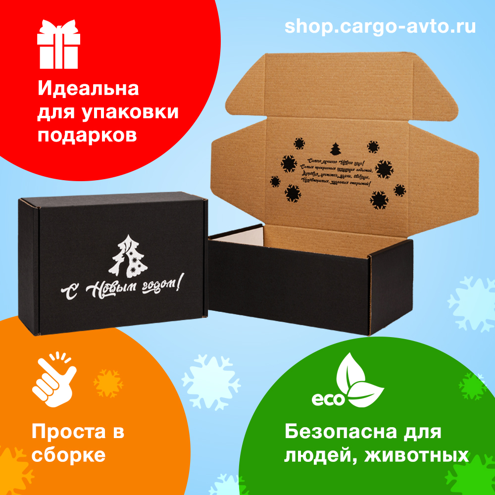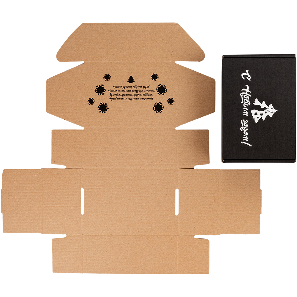 Подарочная коробка «С Новым годом!» чёрная, с поздравительной надписью, длиной 210 мм, шириной 150 мм и высотой 90 мм. Изготовлена из микрогофрокартона Е-22. Полезный объём — 2.83 л.
