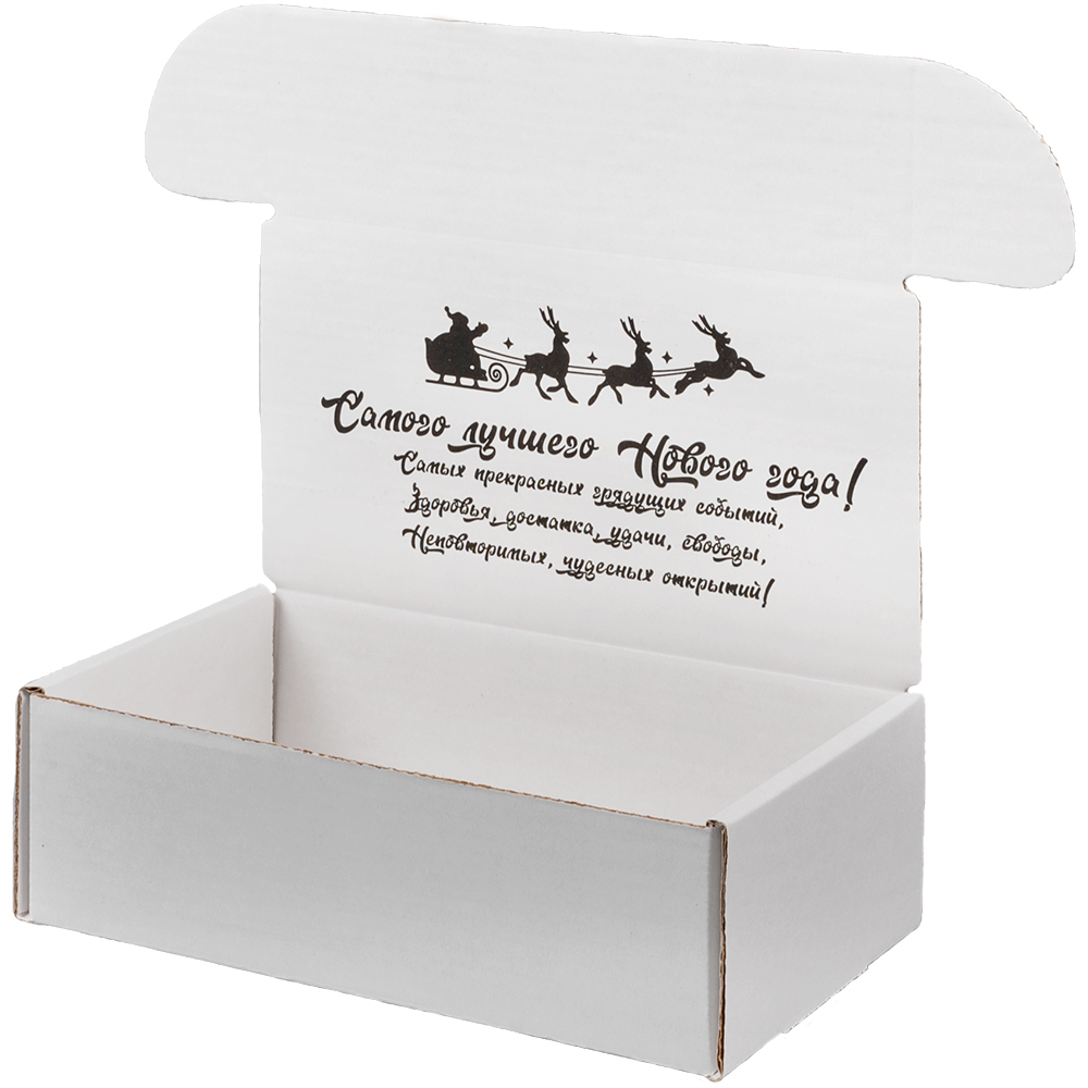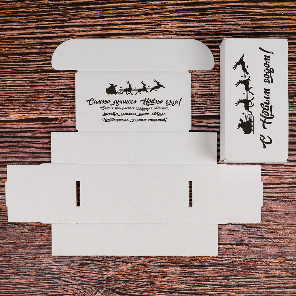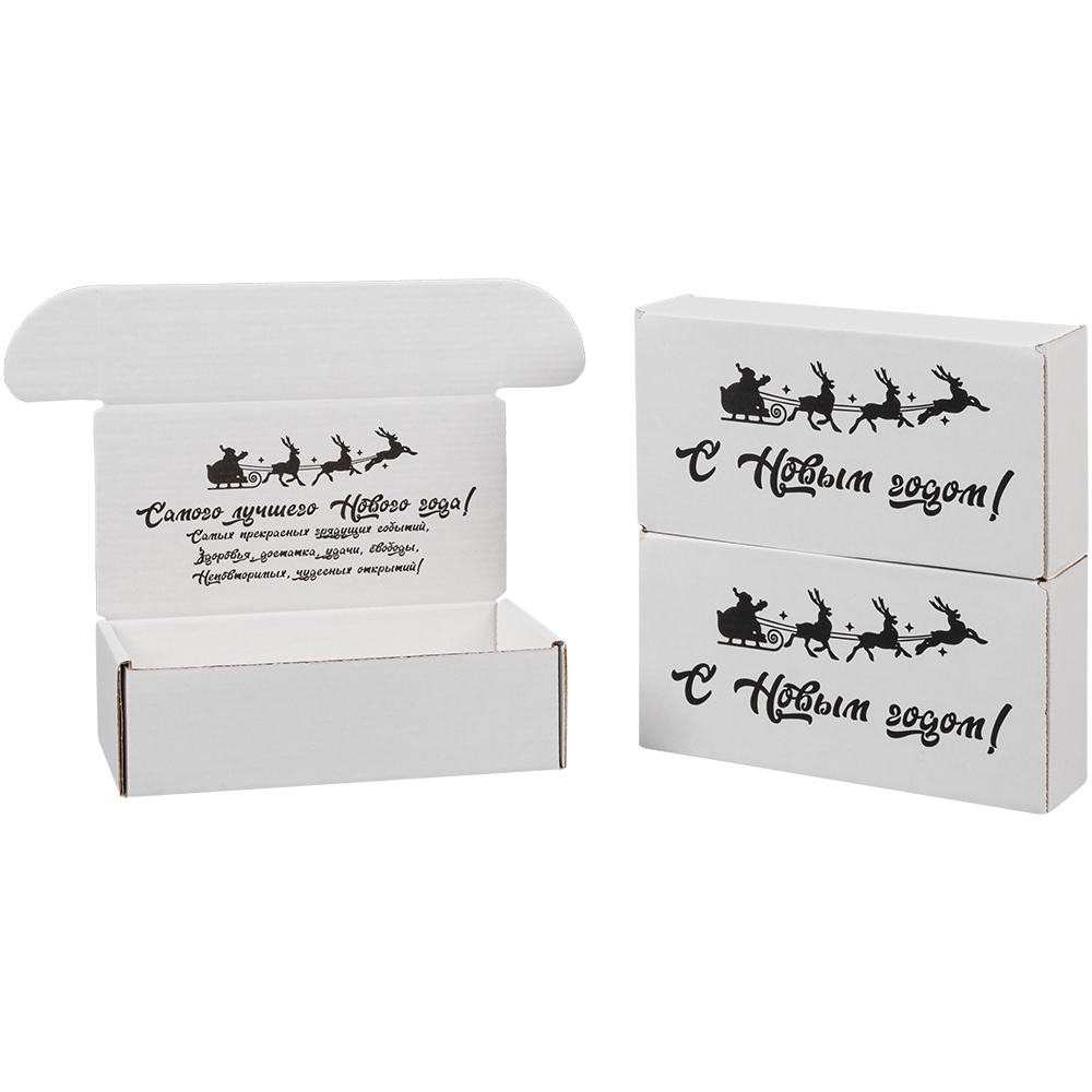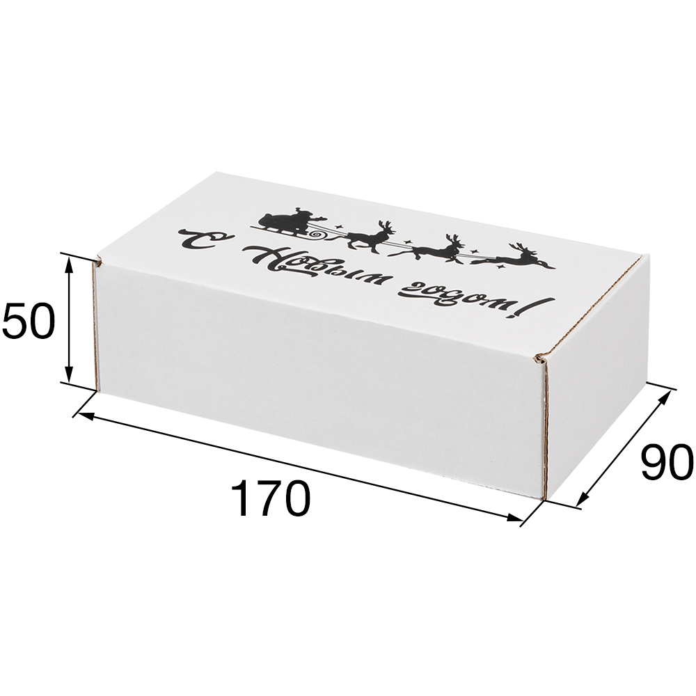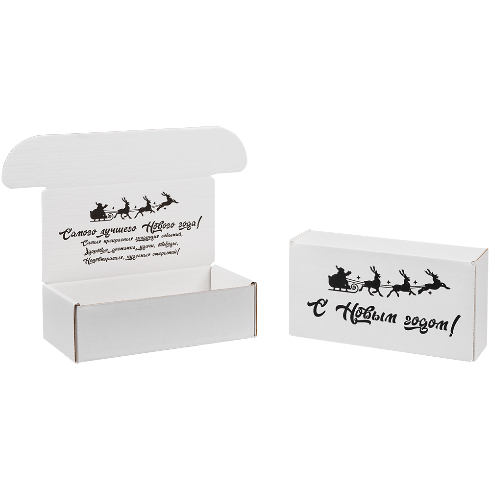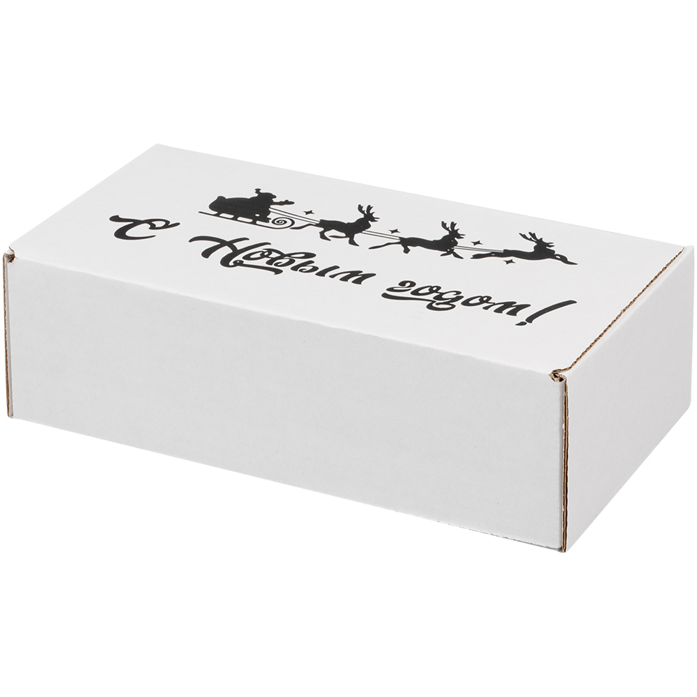 Подарочная коробка «С Новым годом!» белая, с поздравительной надписью, длиной 170 мм, шириной 90 мм и высотой 50 мм. Изготовлена из микрогофрокартона Е-22. Полезный объём — 0.76 л.
