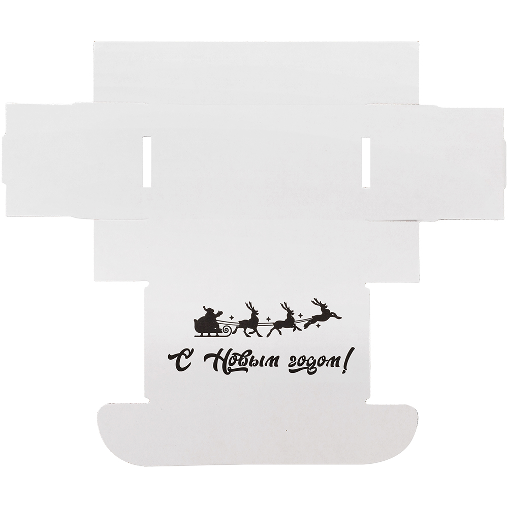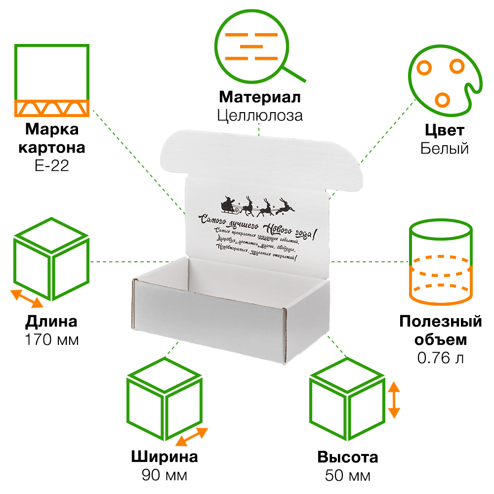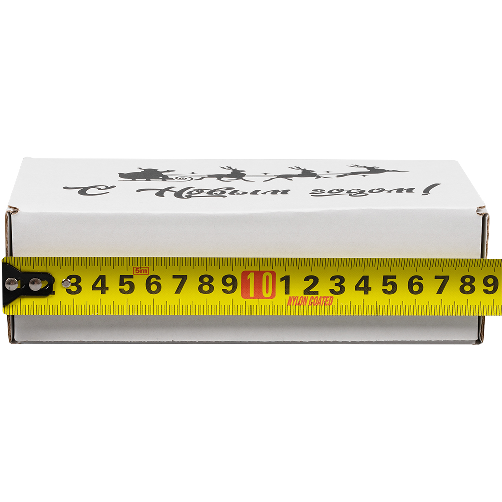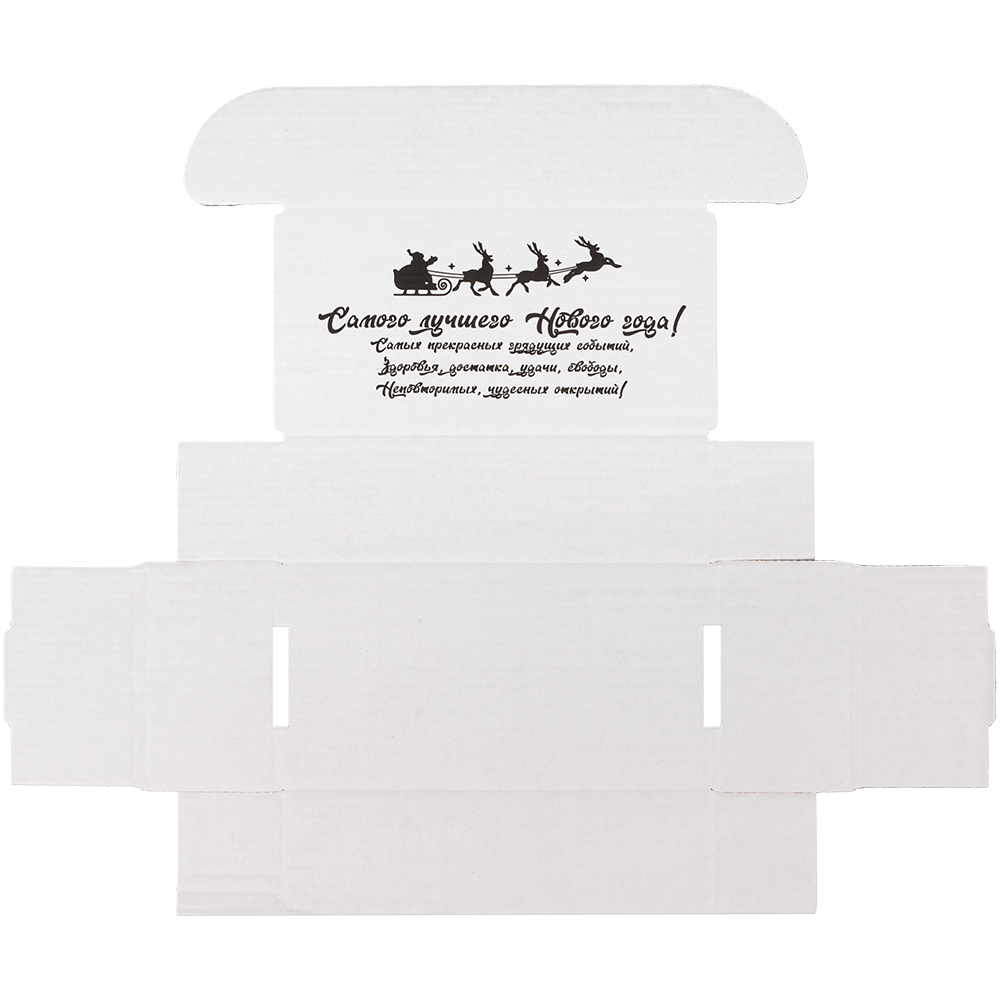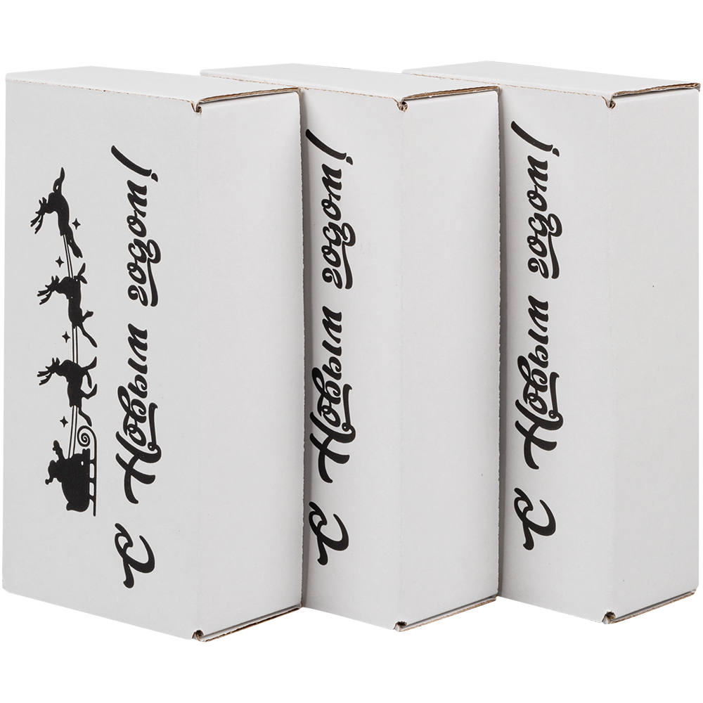 Подарочная коробка «С Новым годом!» белая, с поздравительной надписью, длиной 170 мм, шириной 90 мм и высотой 50 мм. Изготовлена из микрогофрокартона Е-22. Полезный объём — 0.76 л.