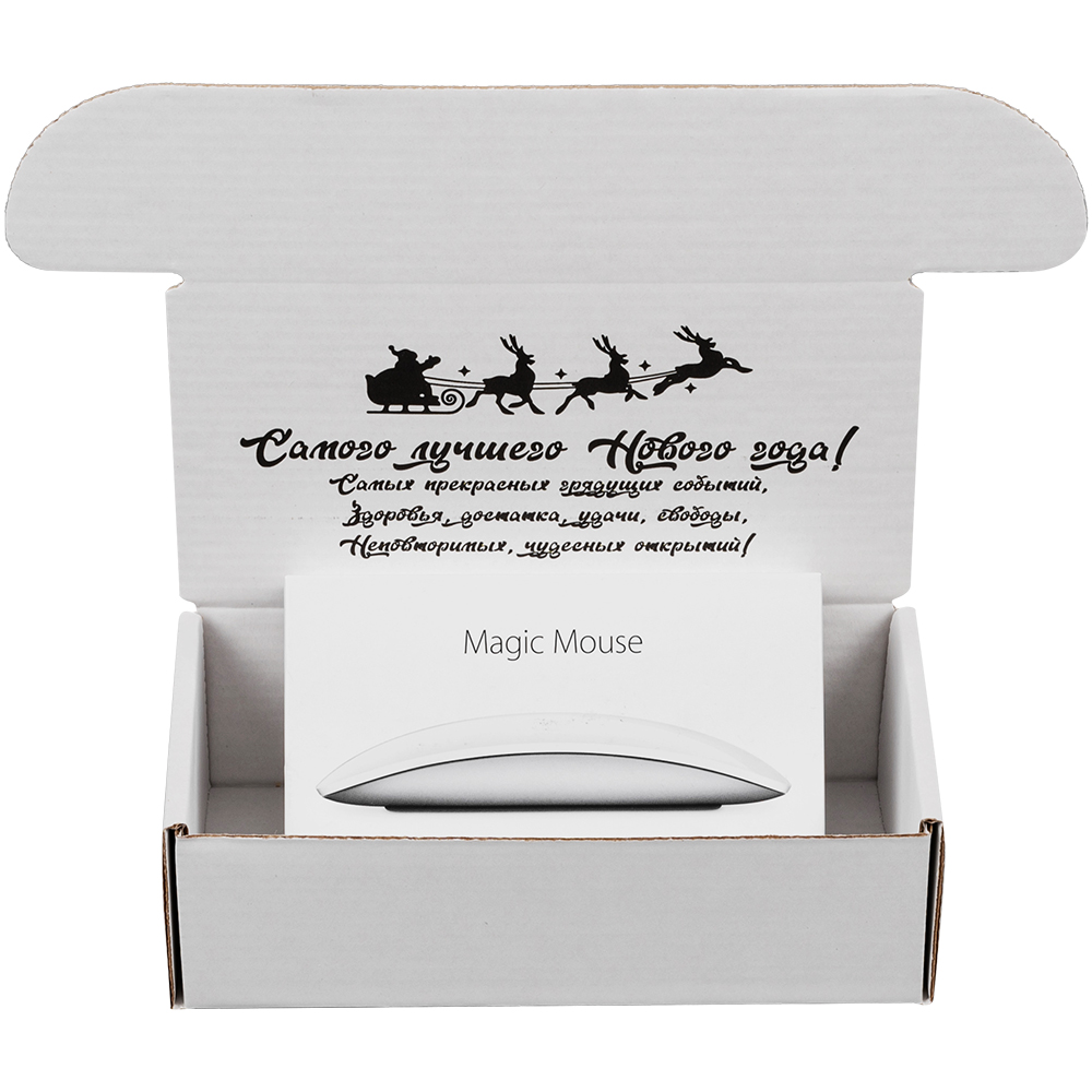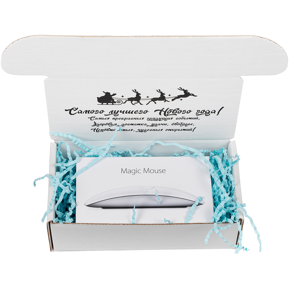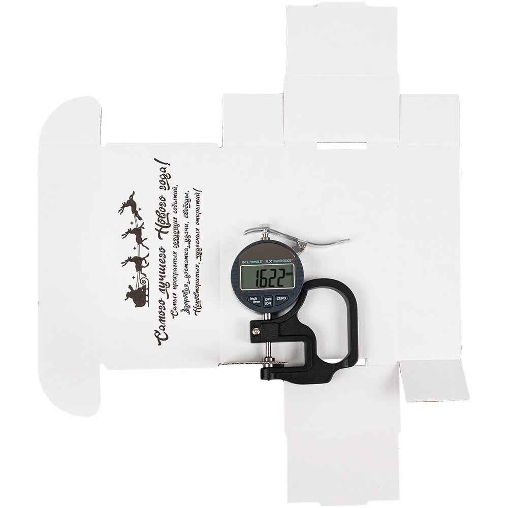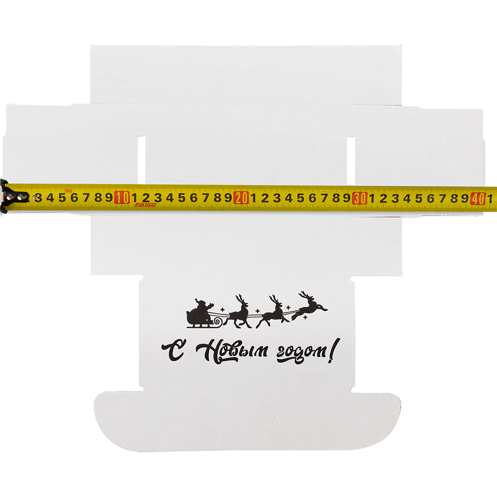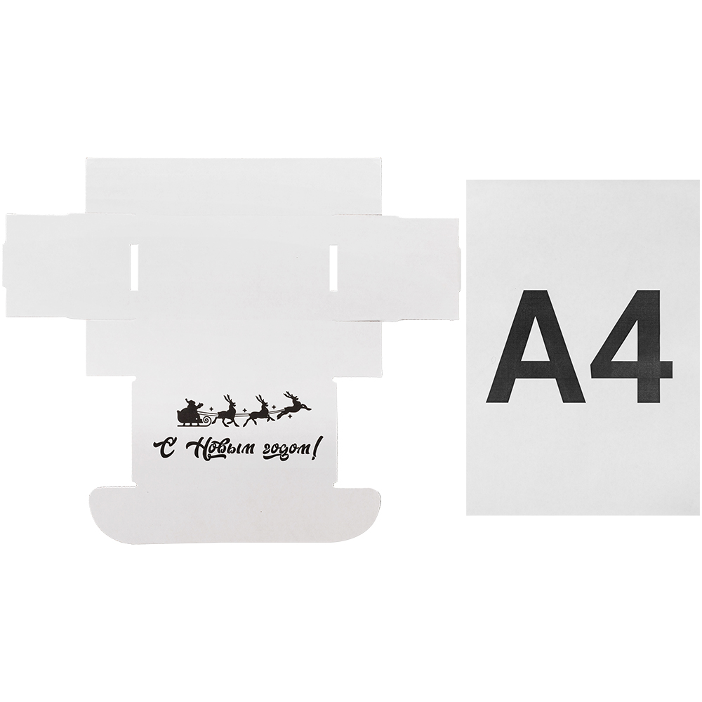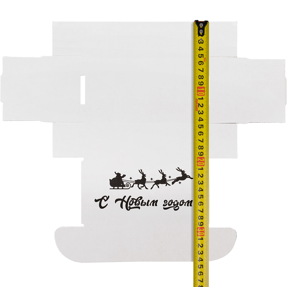 Подарочная коробка «С Новым годом!» белая, с поздравительной надписью, длиной 170 мм, шириной 90 мм и высотой 50 мм. Изготовлена из микрогофрокартона Е-22. Полезный объём — 0.76 л.