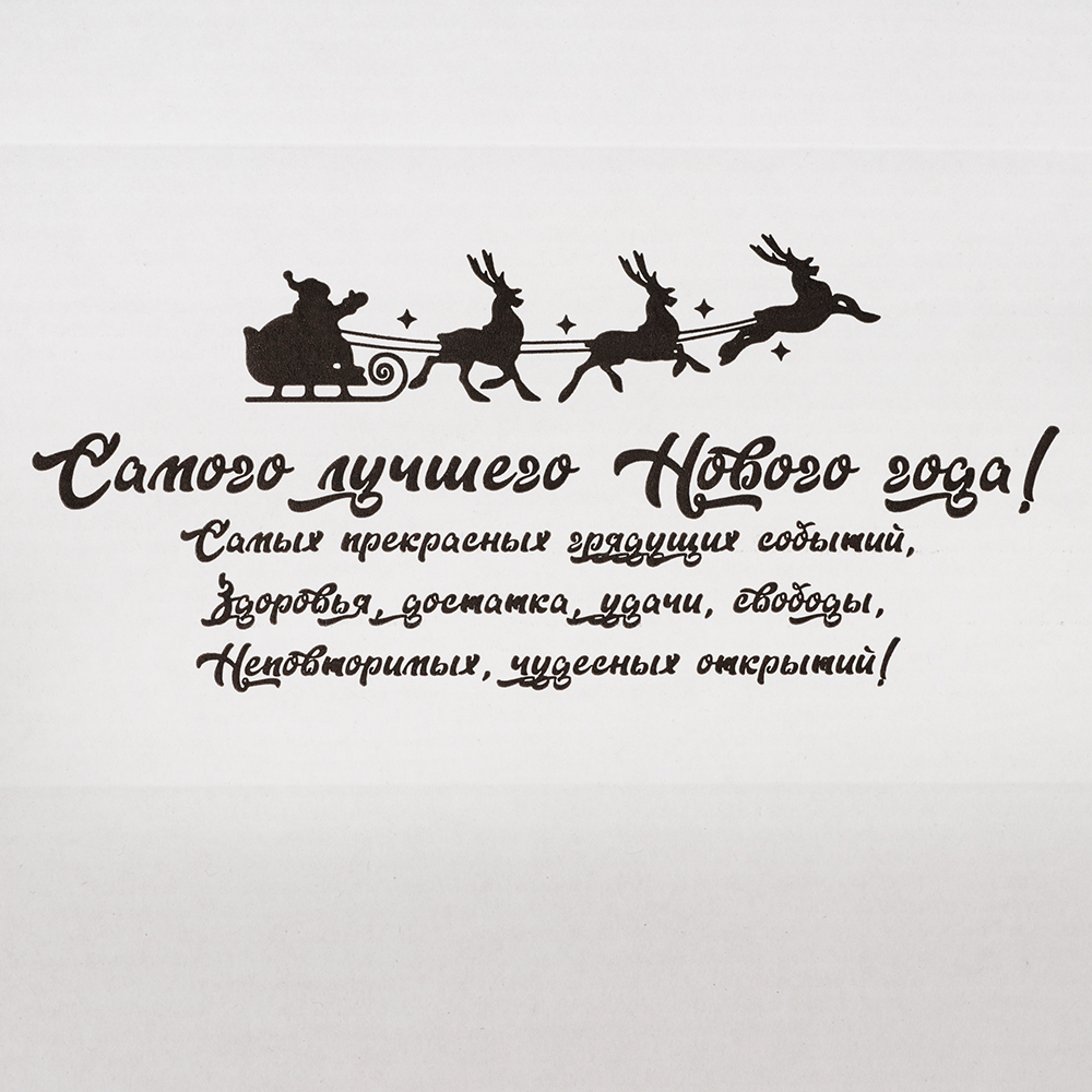 - Вам не придётся заучивать поздравительную речь, ведь на лицевой и внутренней сторонах коробки написаны новогодние поздравления, поэтому она всё скажет за вас.