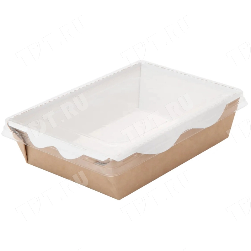 Плоские прямоугольные крафт салатники с прозрачными крышками, объемом 500 мл, длиной (верх/низ) 165 мм/140 мм, шириной (верх/низ) 120 мм/105 мм, высотой 40 мм, в упаковке по 50 штук. Материал – пищевой картон и пластик.