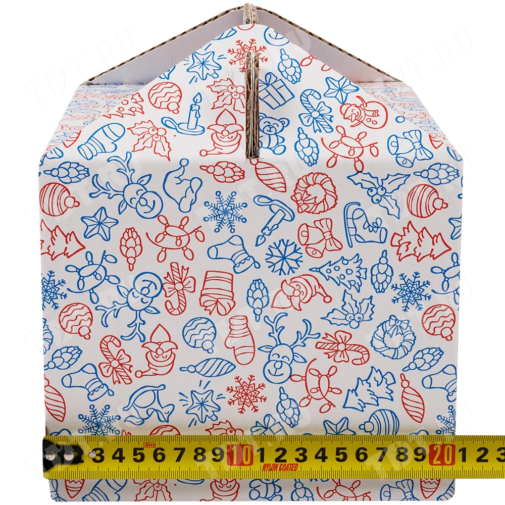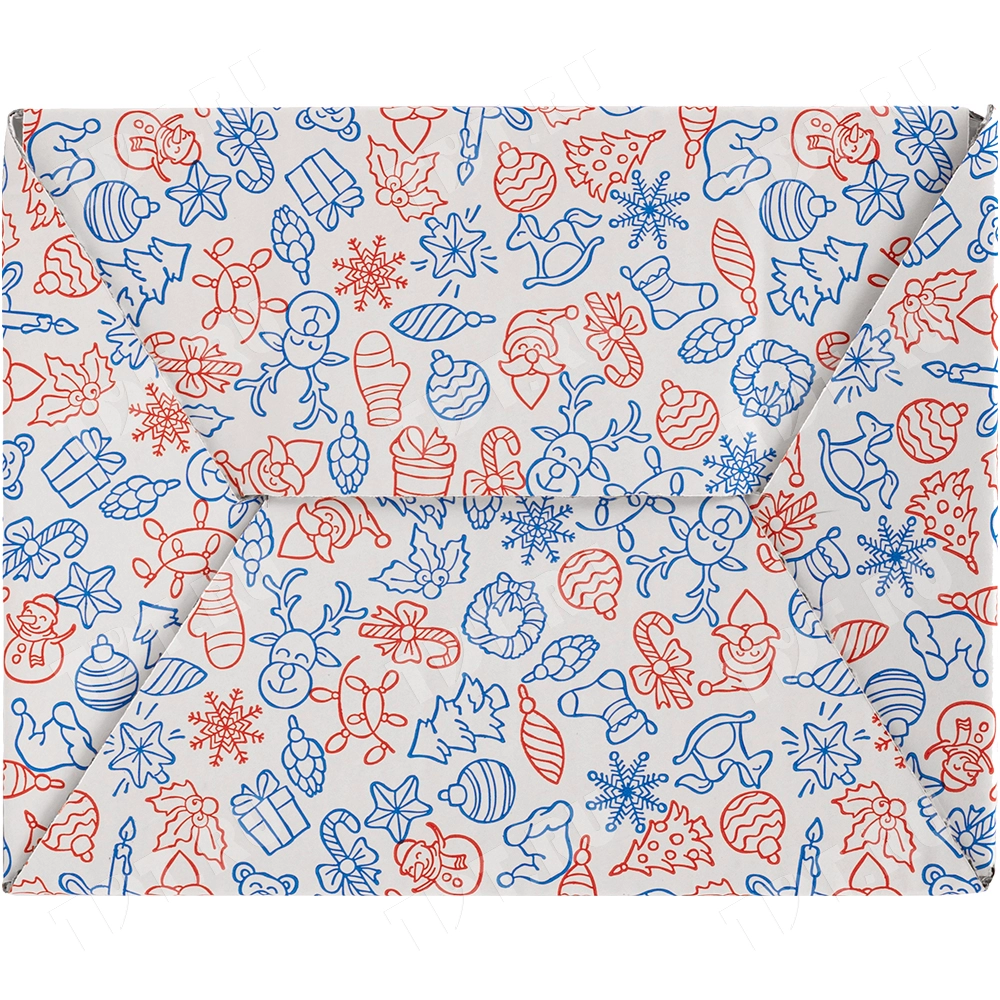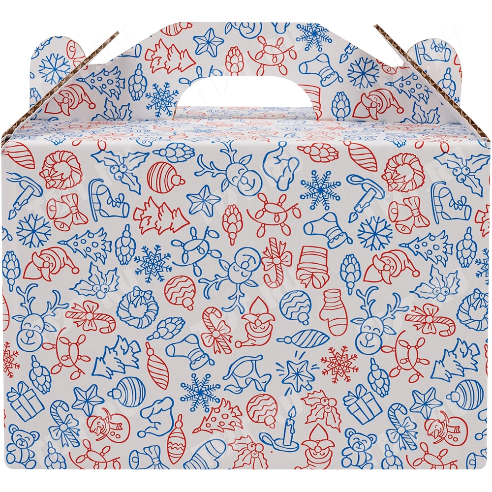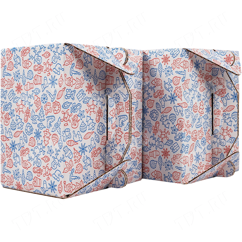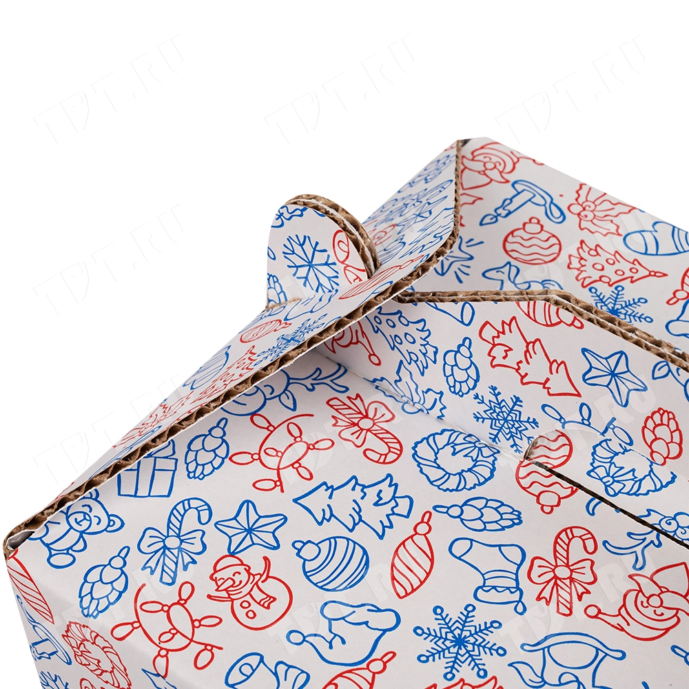 - Вам не придётся украшать коробку самостоятельно, потому что на неё уже нанесён яркий принт в виде ёлочек, снежинок, шариков и других новогодних атрибутов.