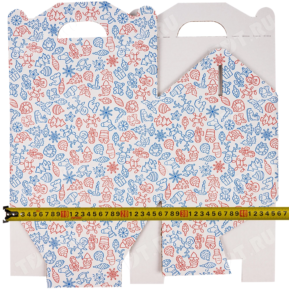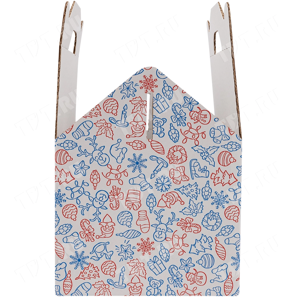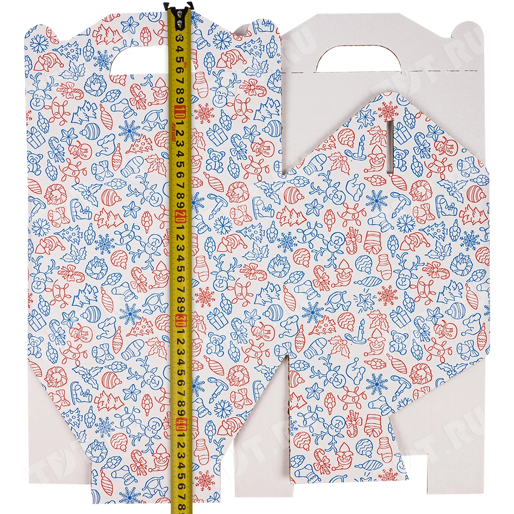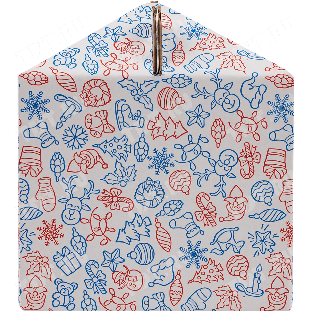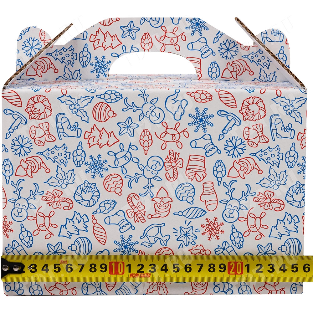 - Вам не придётся украшать коробку самостоятельно, потому что на неё уже нанесён яркий принт в виде ёлочек, снежинок, шариков и других новогодних атрибутов.