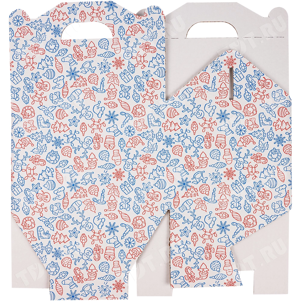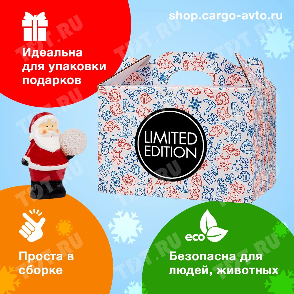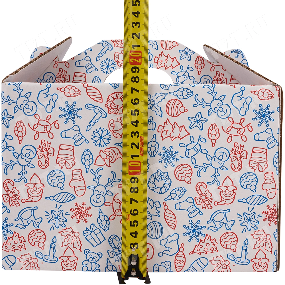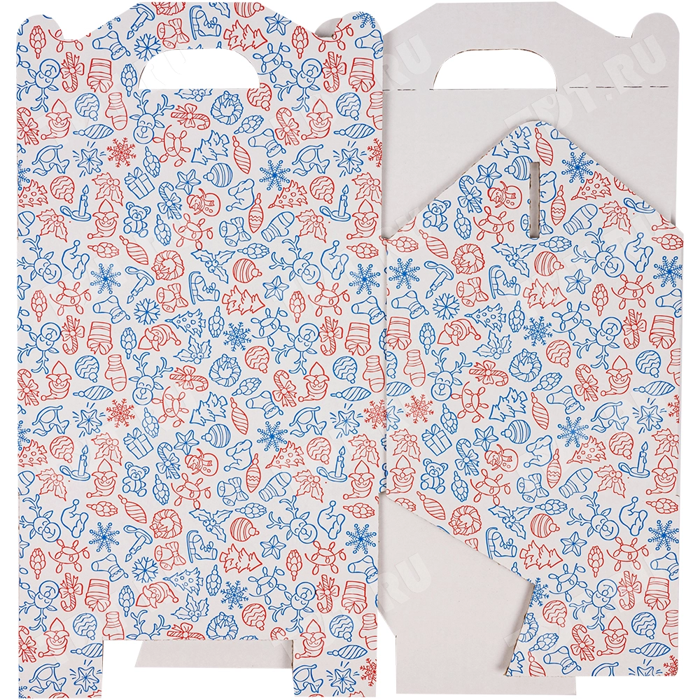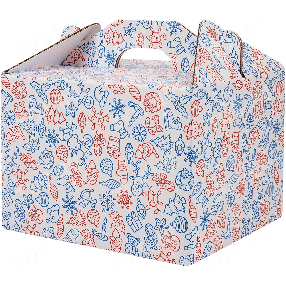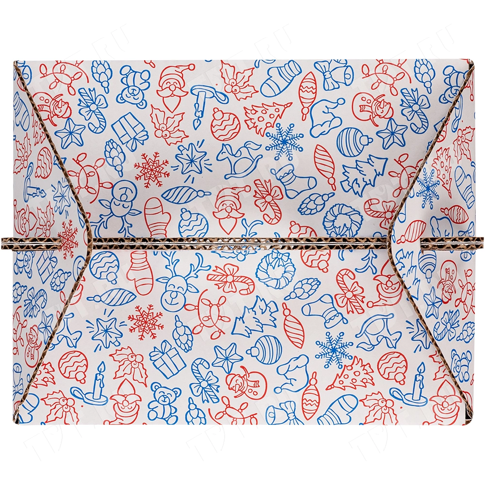 - Вам не придётся украшать коробку самостоятельно, потому что на неё уже нанесён яркий принт в виде ёлочек, снежинок, шариков и других новогодних атрибутов.