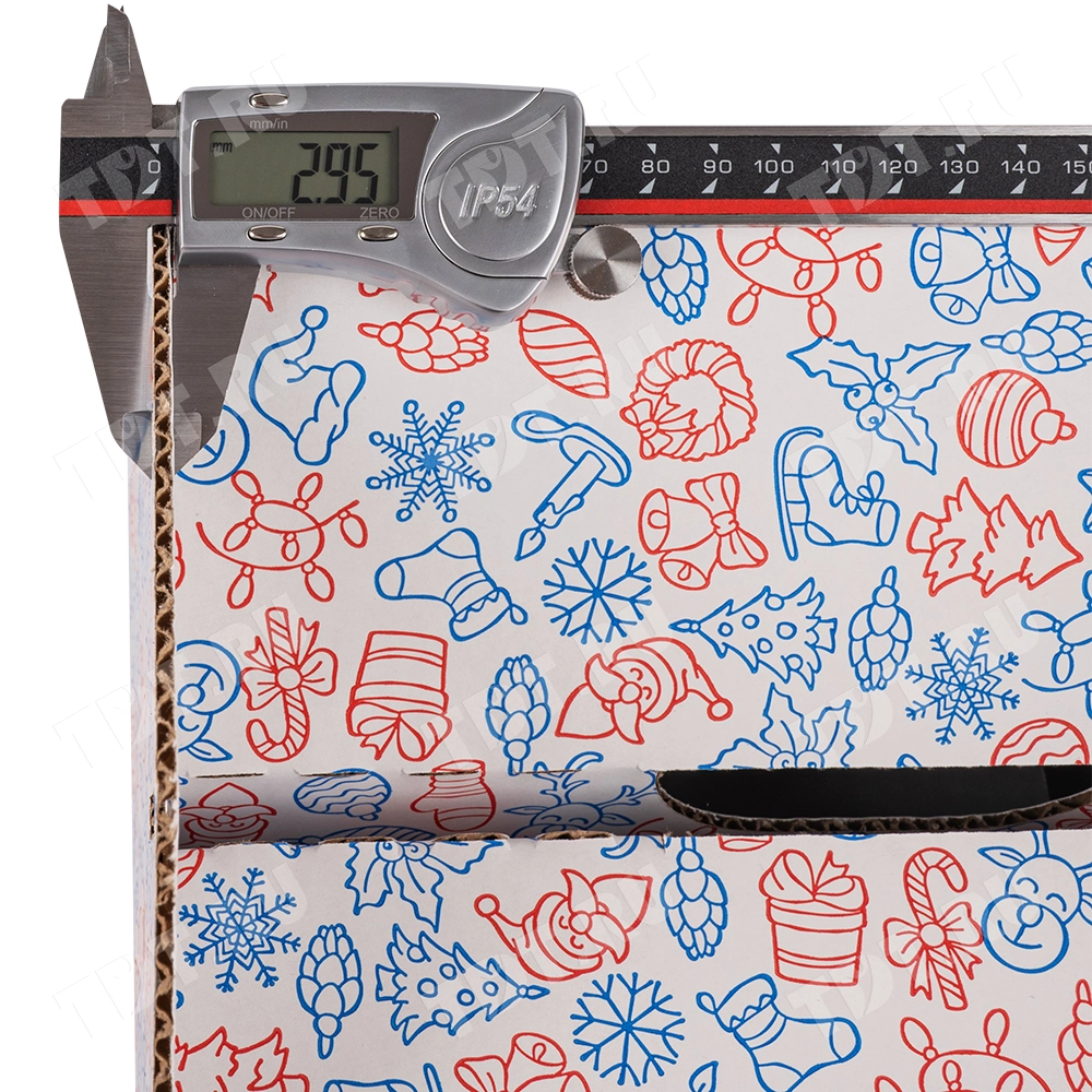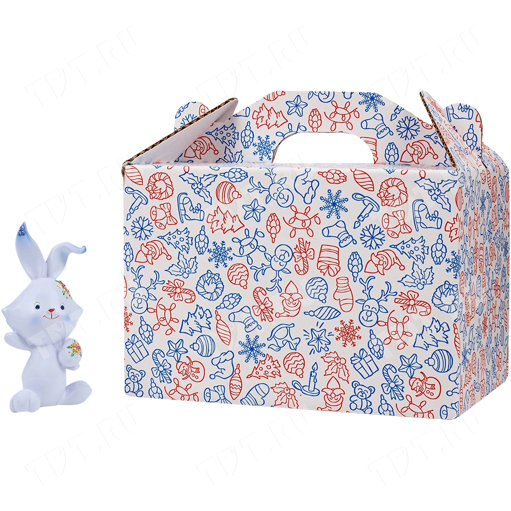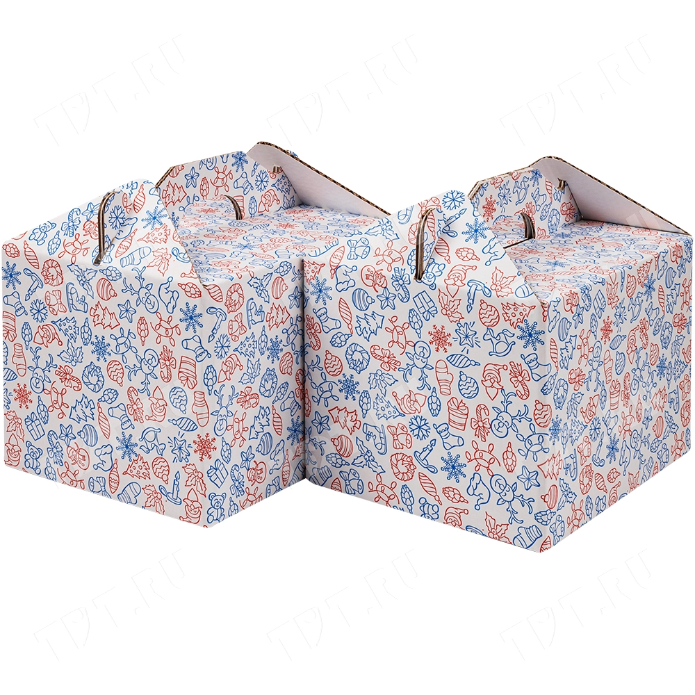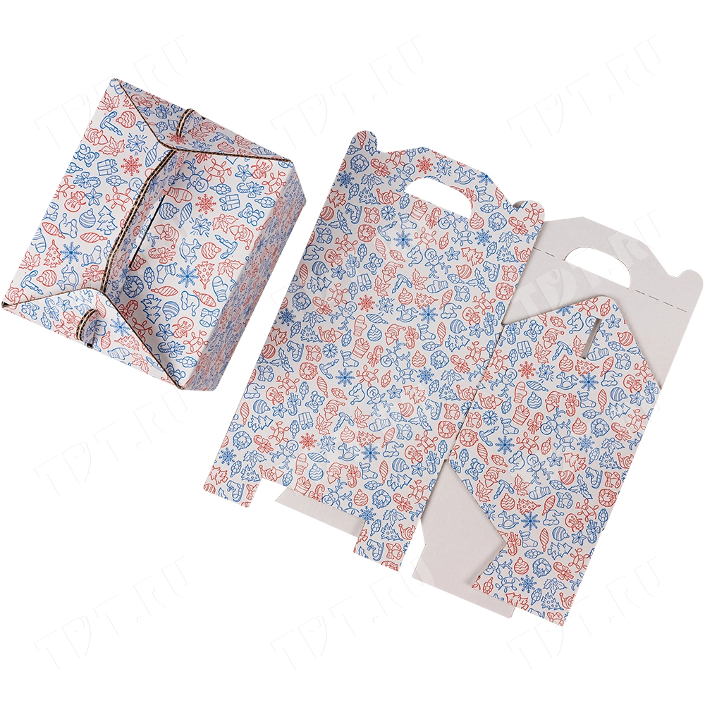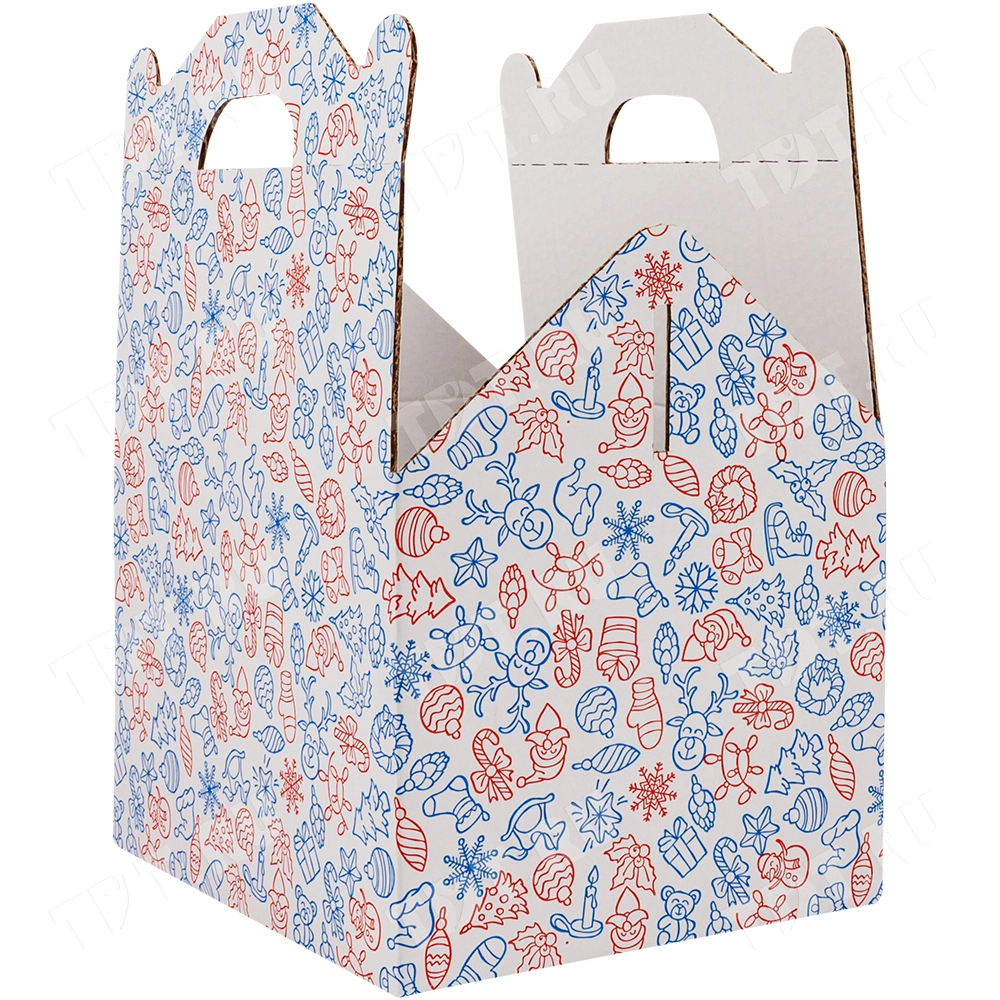 - Вам не придётся украшать коробку самостоятельно, потому что на неё уже нанесён яркий принт в виде ёлочек, снежинок, шариков и других новогодних атрибутов.