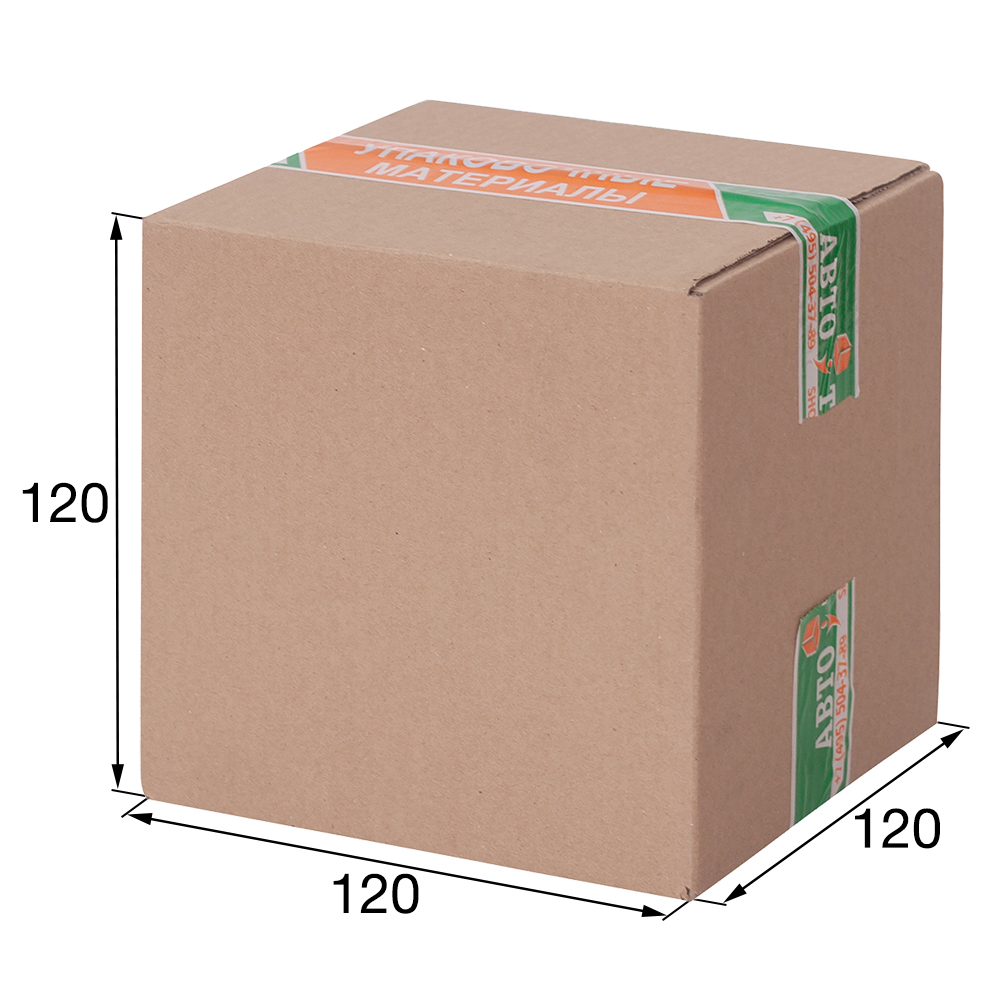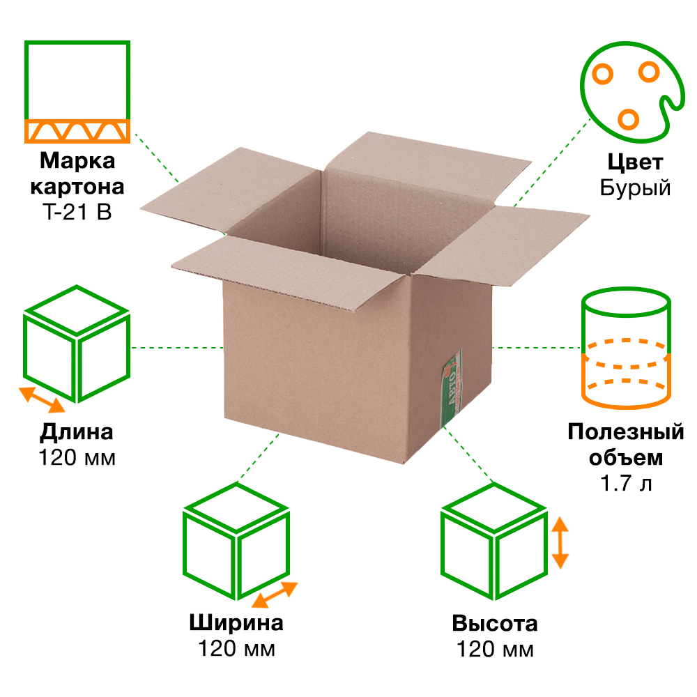 Короб К-440/1 бурого цвета, длиной 120 мм, шириной 120 мм и высотой 120 мм. Изготовлен из трехслойного картона марки Т-21 В. Полезный объём — 1.7 л.