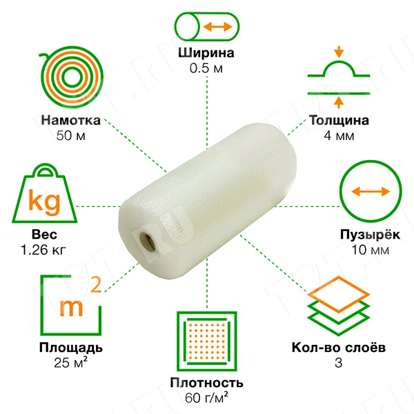 Воздушно пузырьковая трёхслойная пленка с перфорацией «Perforation», намоткой 50 м, шириной рулона 0.5 м, диаметром пузырька 10 мм, диаметром рулона 0.5 м. Частота перфорации — 1 метр. Производится в России.