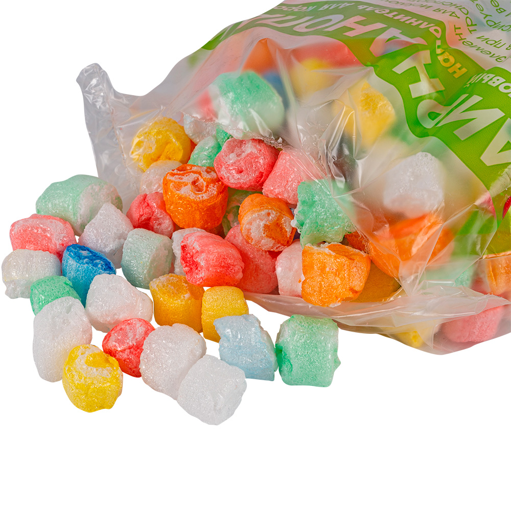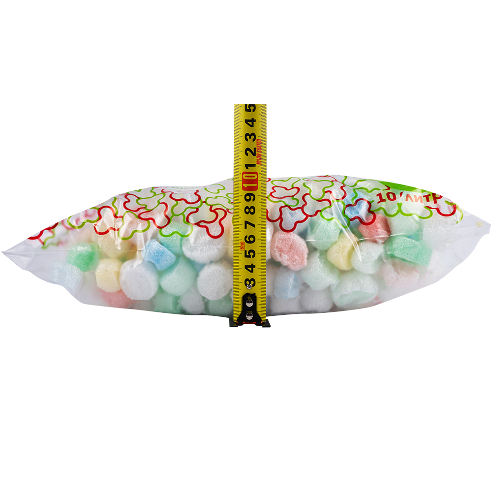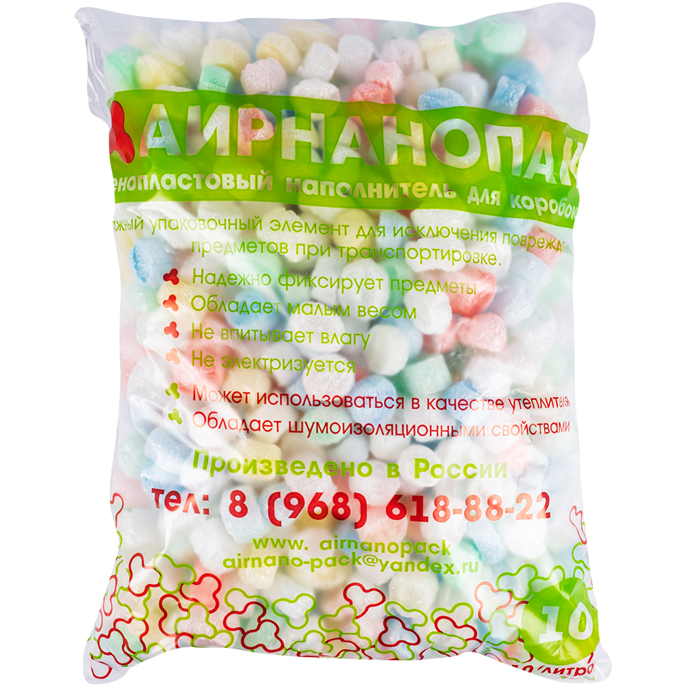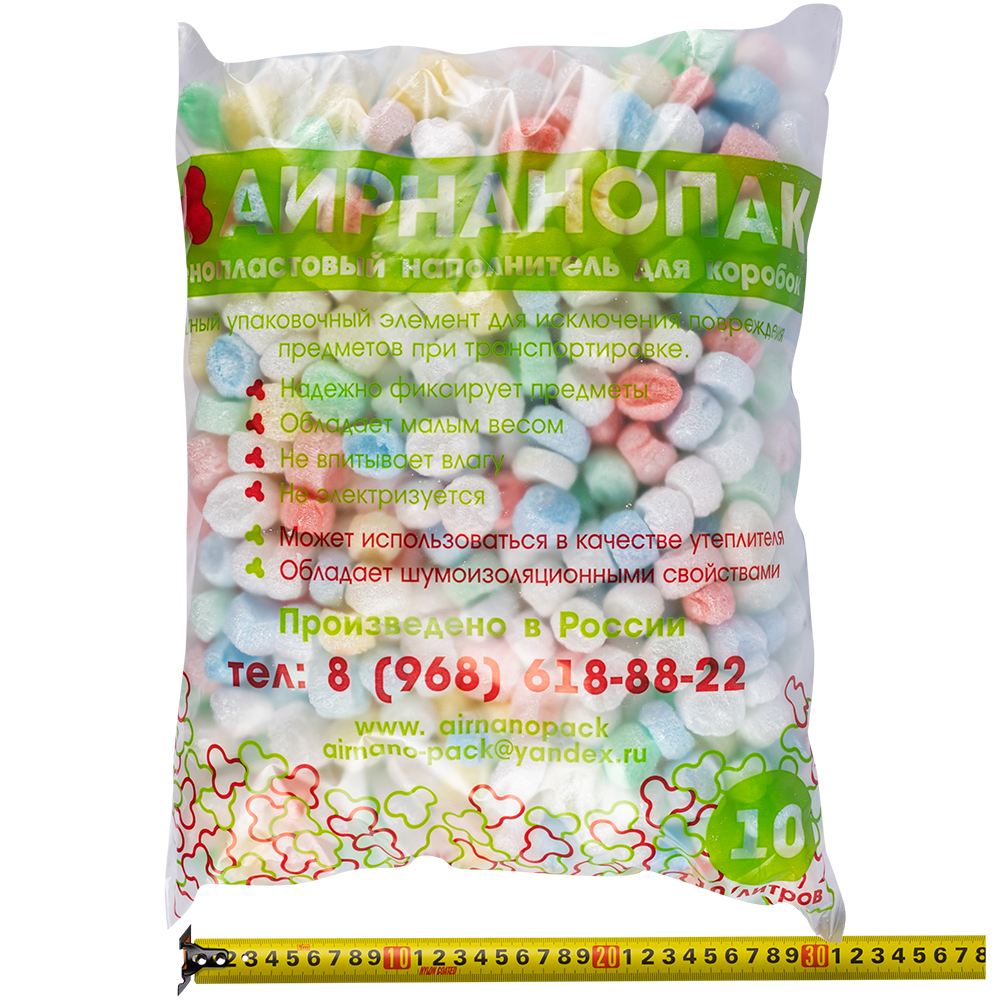 Полистирольный наполнитель «Конфетти», разноцветные, объемом 10 л, транспортным объемом 0.0108 м³. Размер одной конфетти – 26*23*22 мм. Производится в России.