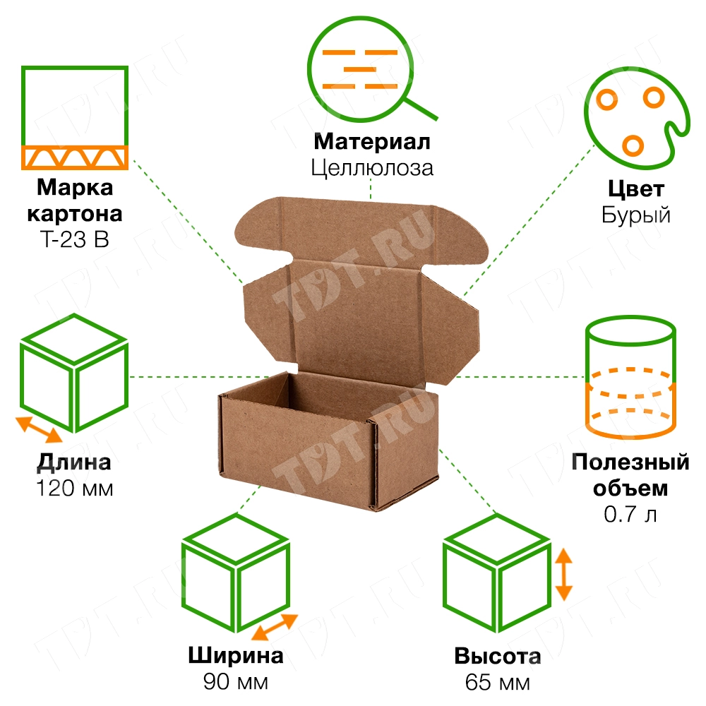Коробка №161 бурого цвета, длиной 120 мм, шириной 90 мм и высотой 65 мм. Изготовлен из гофрокартона Т-23 В. Полезный объём — 0.7 л.