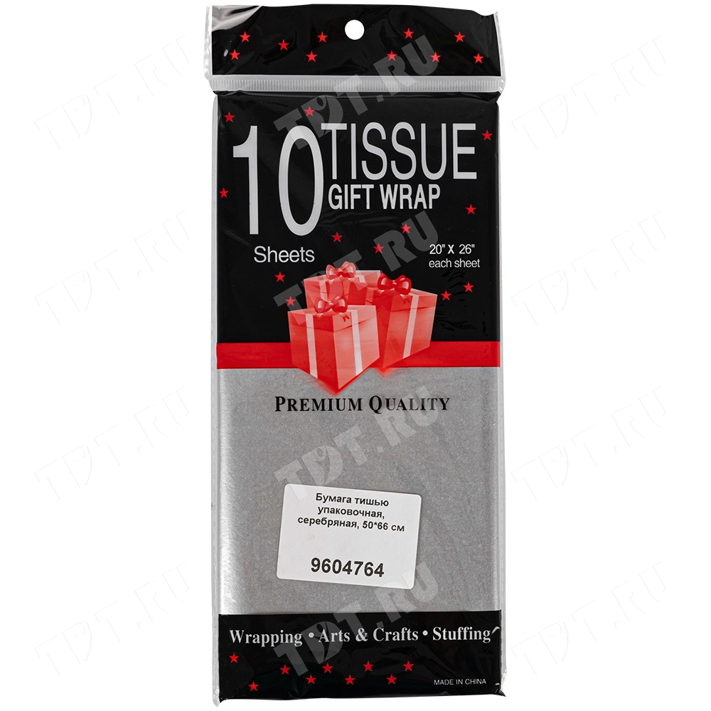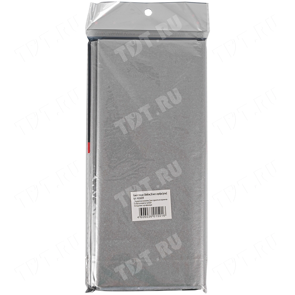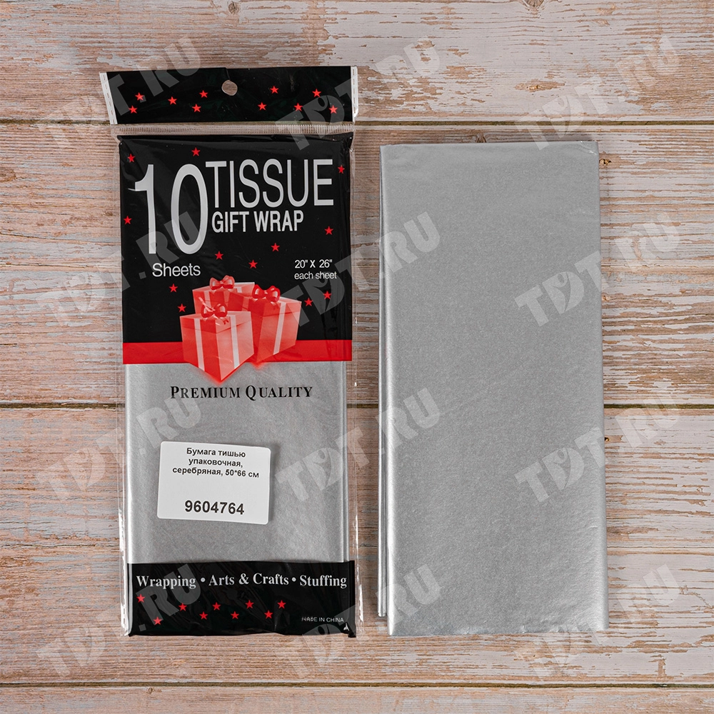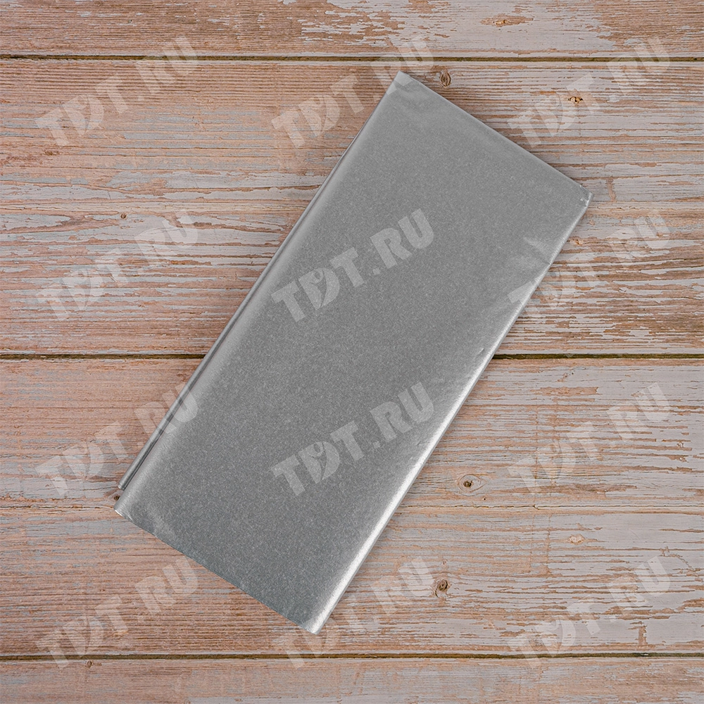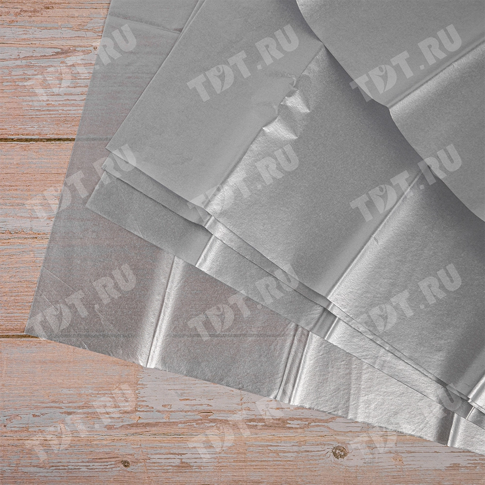 Серебряная бумага тишью шириной 50 см, длиной 66 см, плотностью 20 г/м² по 10 листов в упаковке. Шероховатая упаковочная бумага для оформления и украшения подарков.