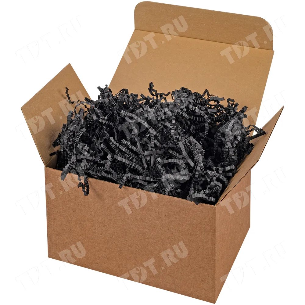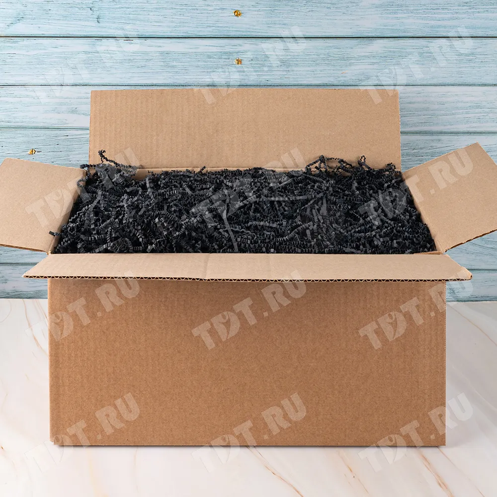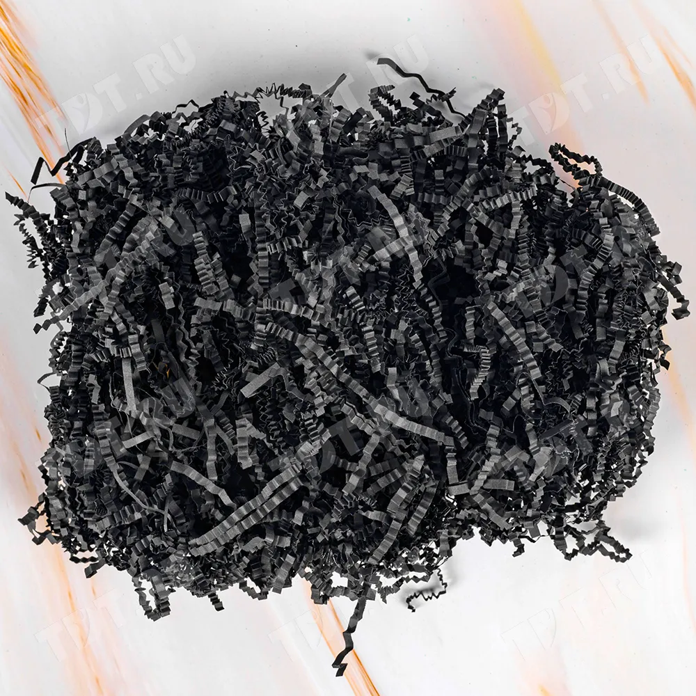 Бумажный подарочный наполнитель «Чёрная материя» из простой бумаги, чёрного цвета, весом 1 кг, плотностью 80 г/м², шириной резки 2-3 мм. Производится в России.